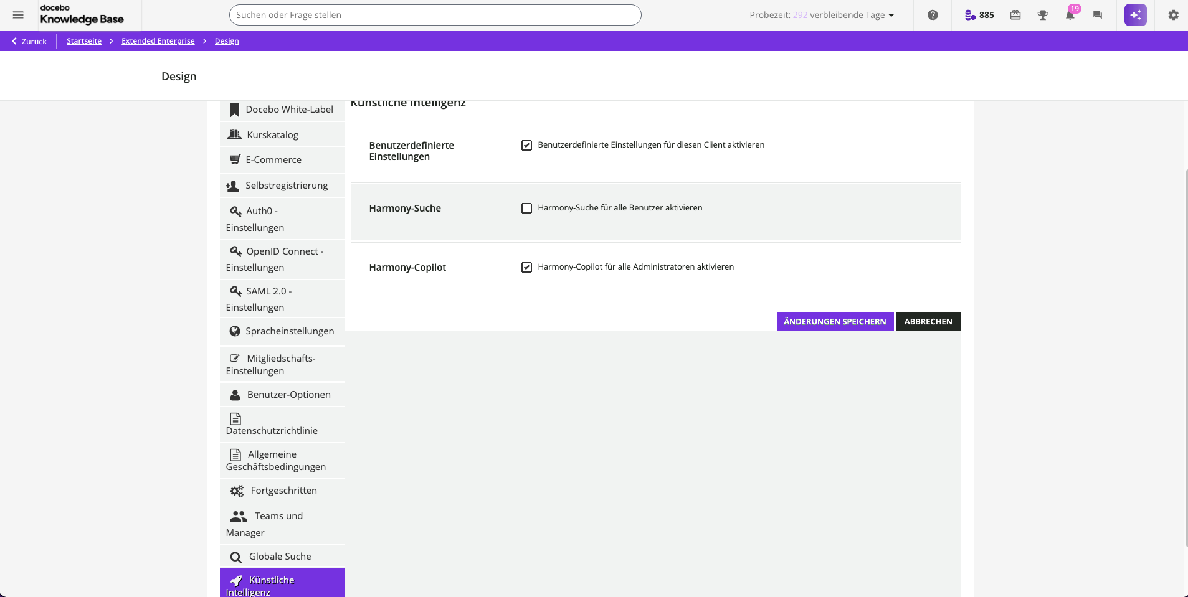 - Extended Enterprise mit benutzerdefinierten Einstellungen für Künstliche Intelligenz und deaktiviertem Harmony-Copilot.