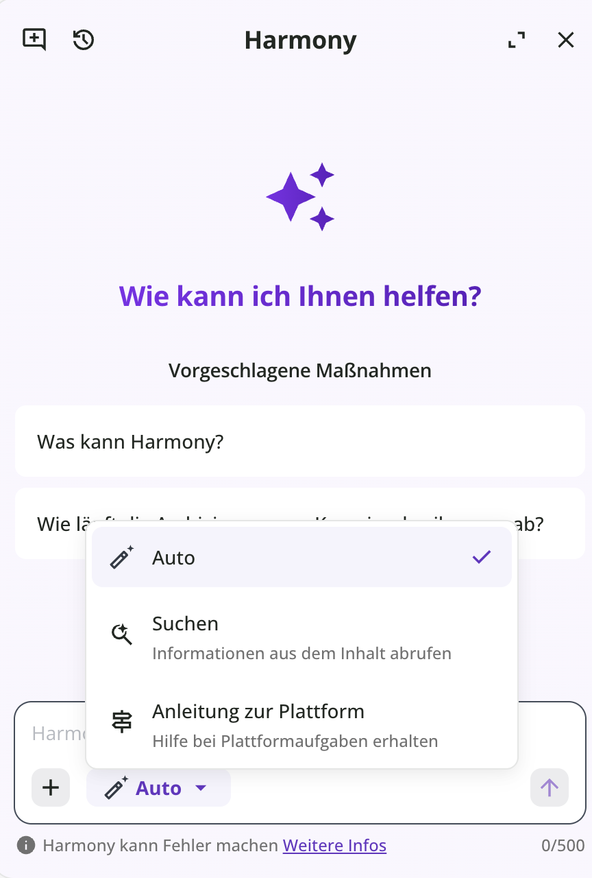 Zusätzlich greift der Harmony-Copilot auf dieselben Plattformquellen wie Harmony Search zurück, um Sie bei der Informationsbeschaffung über Plattforminhalte zu unterstützen. Erfahren Sie mehr.