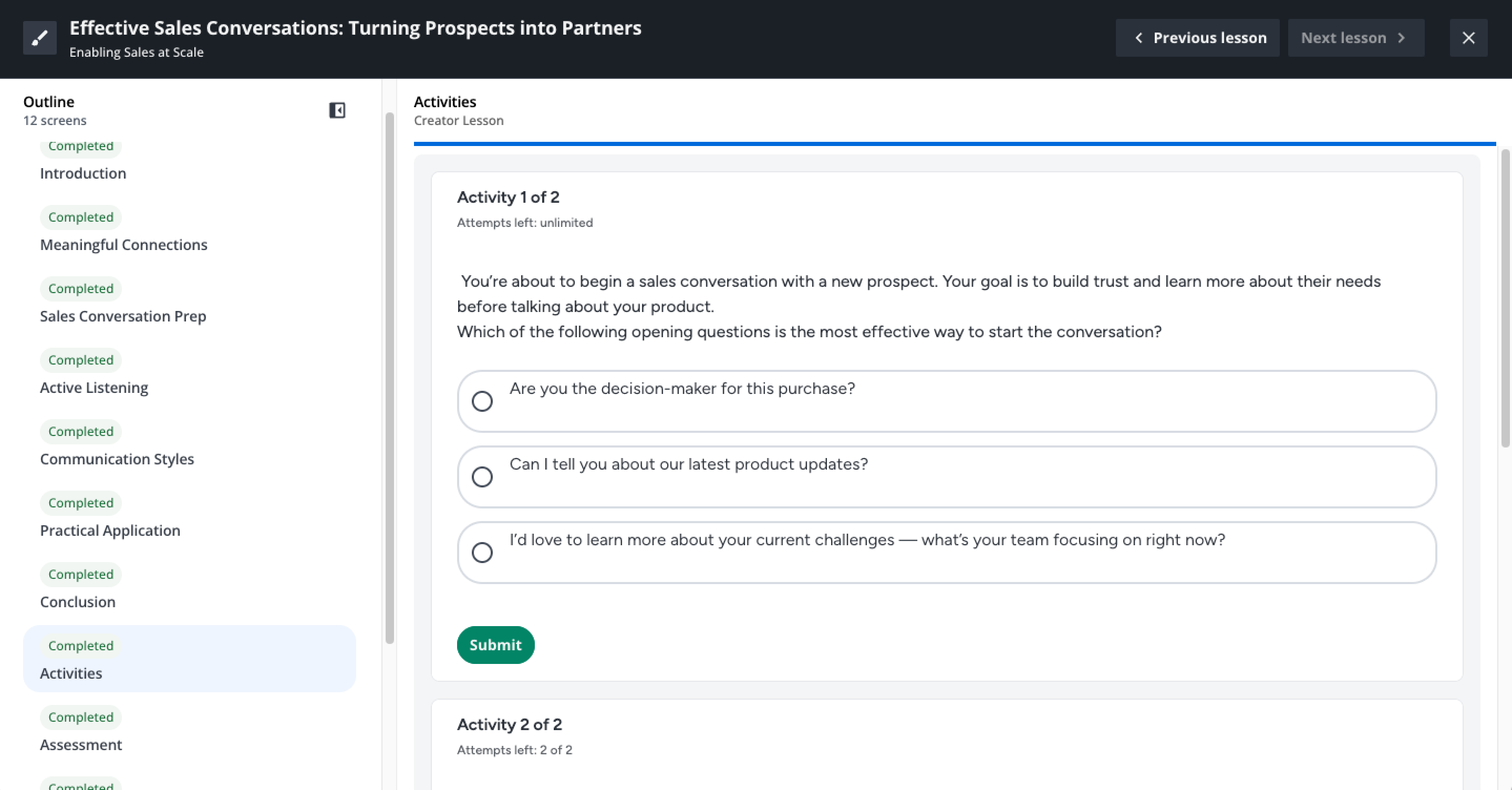 Je nach Konfiguration kann es eine maximale Anzahl von Versuchen und eine Punktzahl für jede Aktivität geben. Die verbleibenden Versuche sind auf der Aktivitätskarte sichtbar. Um die mögliche Punktzahl zu sehen, die mit der Aktivität verbunden ist, müssen Sie diese zuerst abschließen. Aktivitäten können je nach Konfiguration Ihres Administrators verpflichtend oder optional sein. Wenn sie verpflichtend sind, können Sie den Unterricht nicht abschließen, ohne sie abzuschließen.