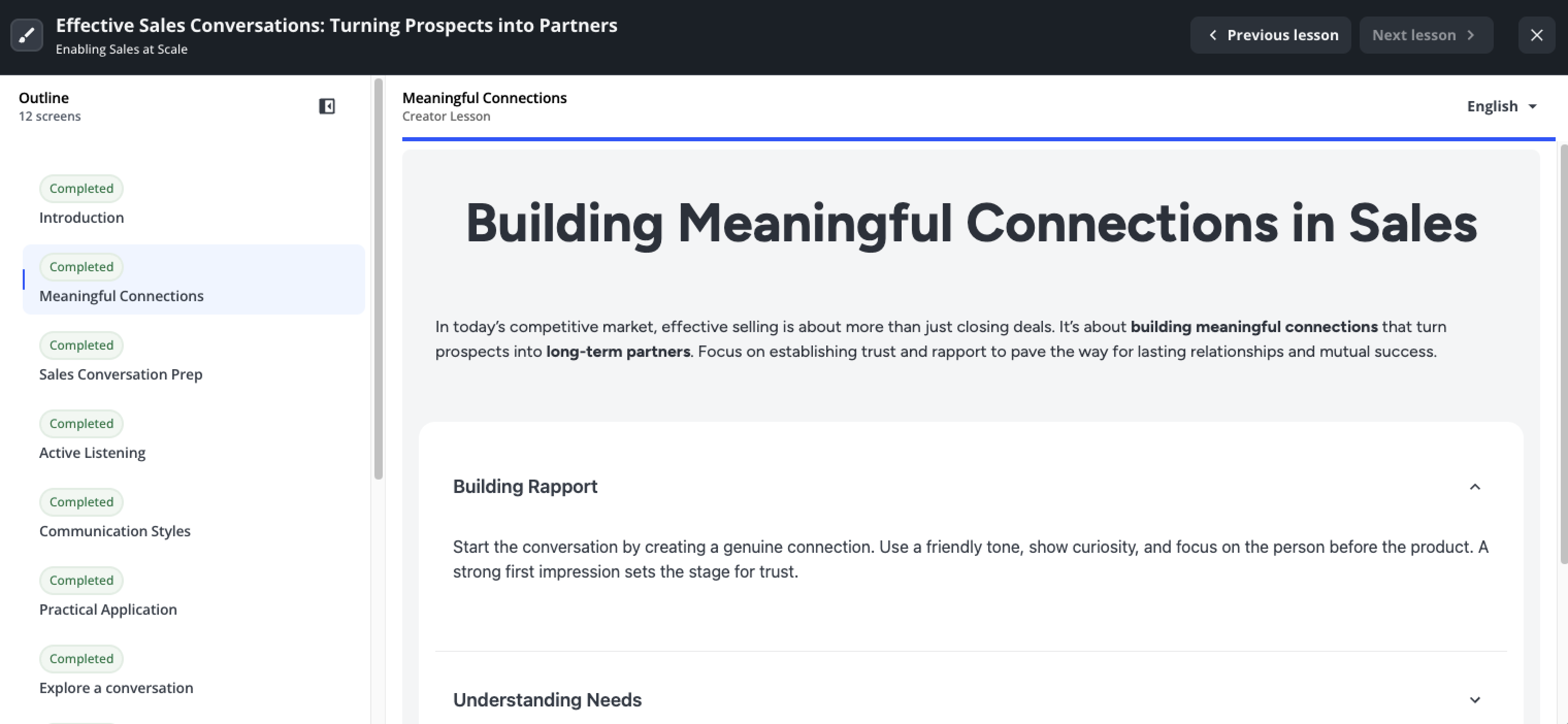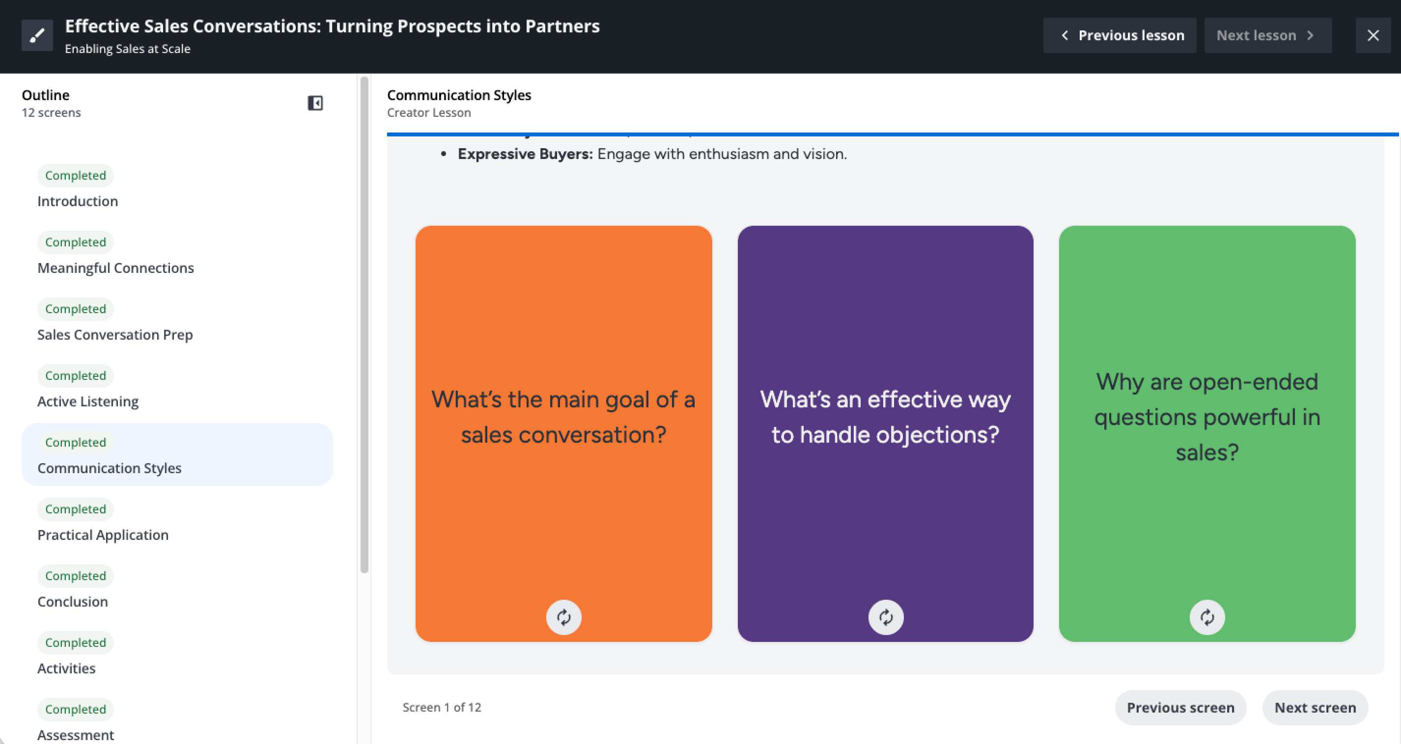Um durch den Unterricht zu navigieren, können Sie die Gliederung auf der linken Seite der Seite verwenden, um den gewünschten Bildschirm auszuwählen, oder die Schaltflächen Vorheriger Bildschirm und Nächster Bildschirm unten verwenden. Wenn Sie den letzten Bildschirm abgeschlossen haben, klicken Sie auf Unterricht abschließen, um zum nächsten Unterricht zu wechseln oder den Kurs abzuschließen, falls es den letzten Unterricht ist.
