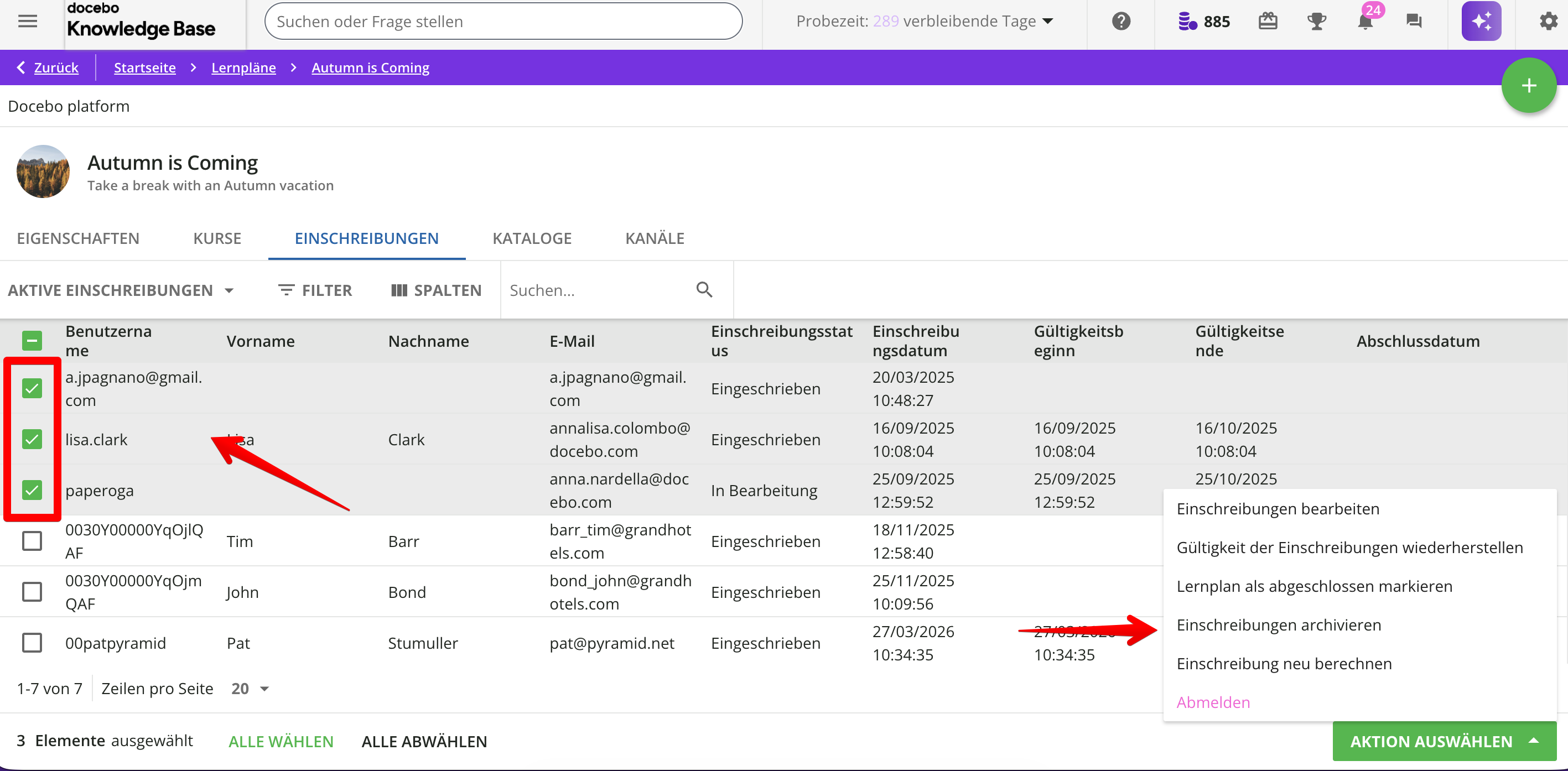 Wählen Sie im Einschreibungen-Tab des Lernplans die Kontrollkästchen am Anfang der Zeilen der Benutzer aus, deren Einschreibungen Sie archivieren möchten, klicken Sie dann unten rechts in der Tabelle auf die Schaltfläche Aktion auswählen und wählen Sie Einschreibungen archivieren.