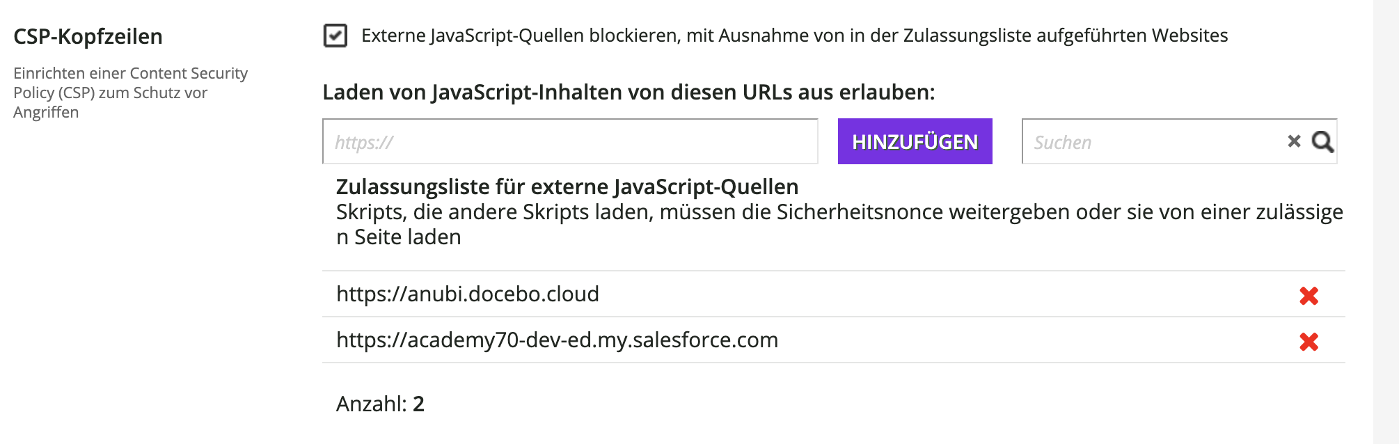 - Geben Sie unter Zulassungsliste für externe JavaScript-Quellen die URLs vertrauenswürdiger Domains ein, die JavaScript laden dürfen.