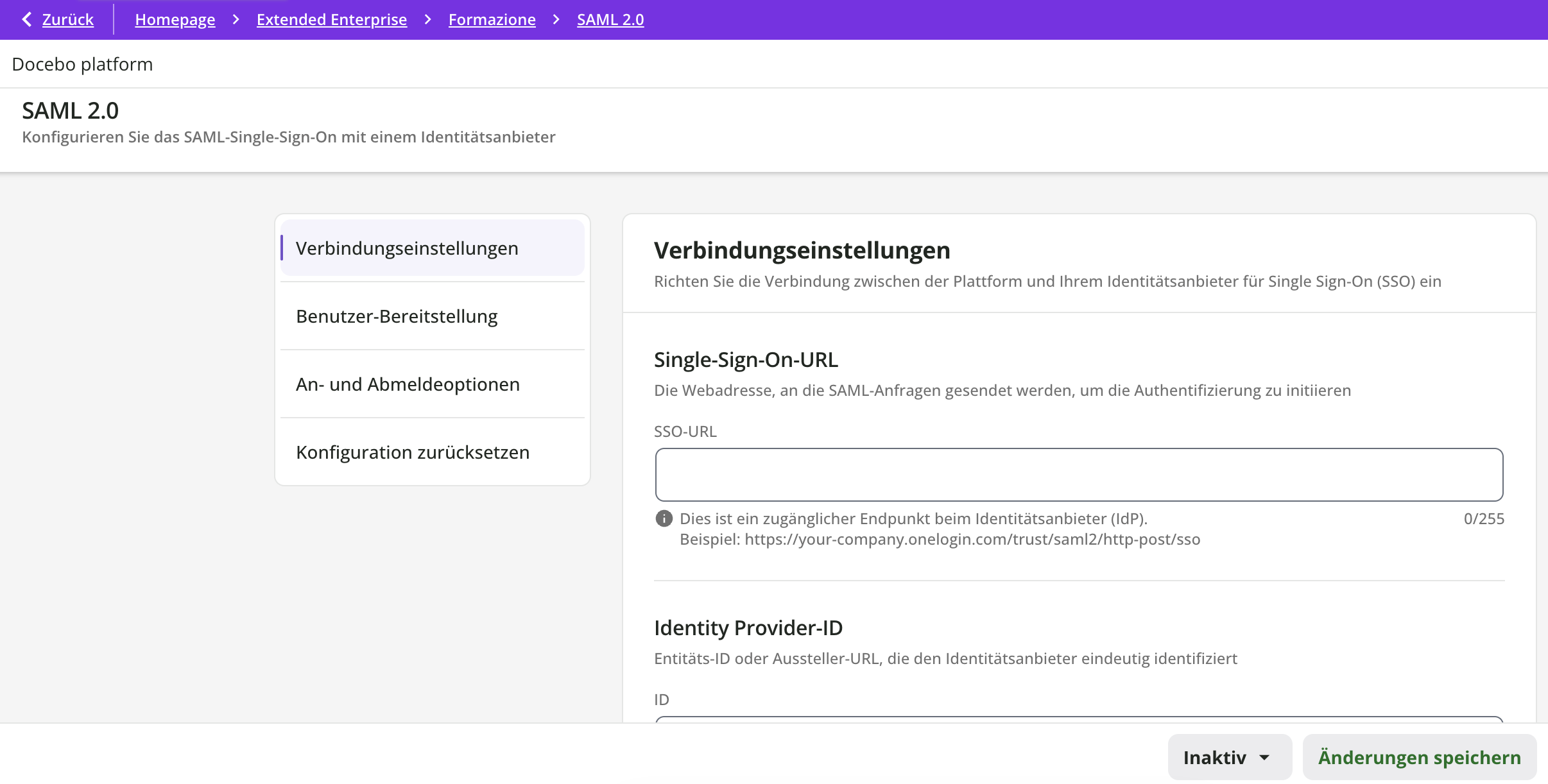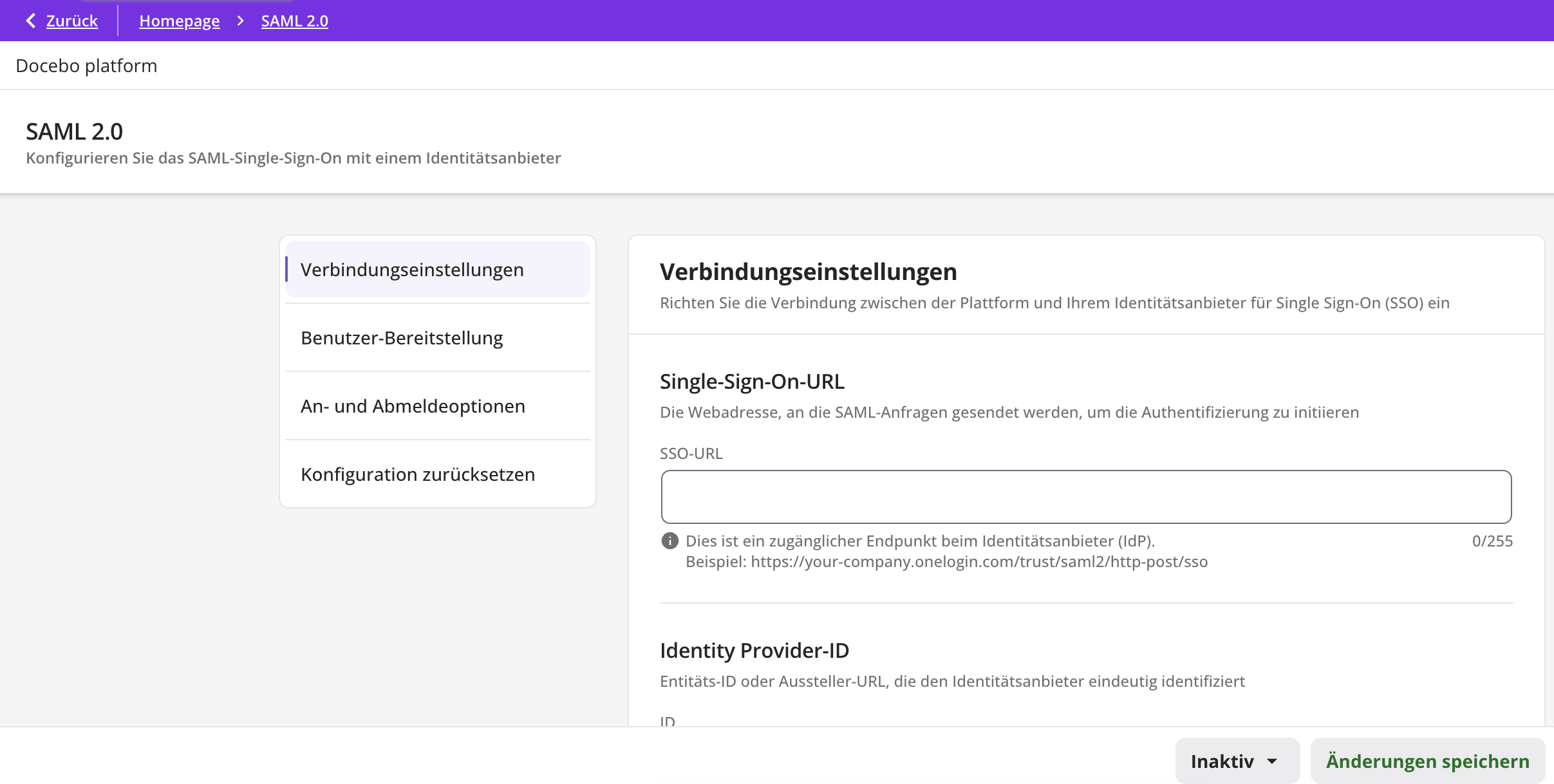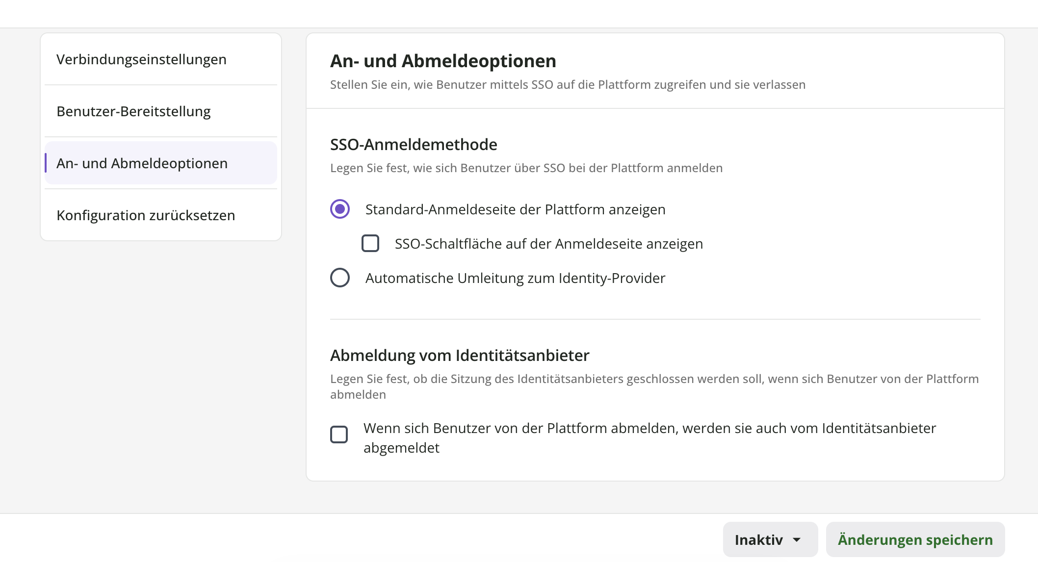 Verbindungseinstellungen: Hier richten Sie die Verbindung zwischen der Plattform und Ihrem Identitätsanbieter für Single Sign-On ein.