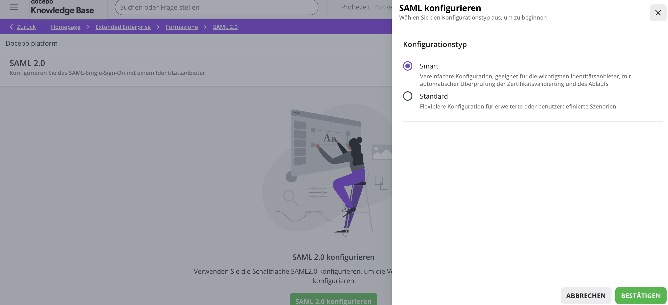 Bitte beachten Sie, dass die Plattform zwei Optionen für die SAML-Konfiguration bietet: Smart und Standard. Für einen Überblick über die Unterschiede lesen Sie den Artikel Einführung in Docebo für SAML.