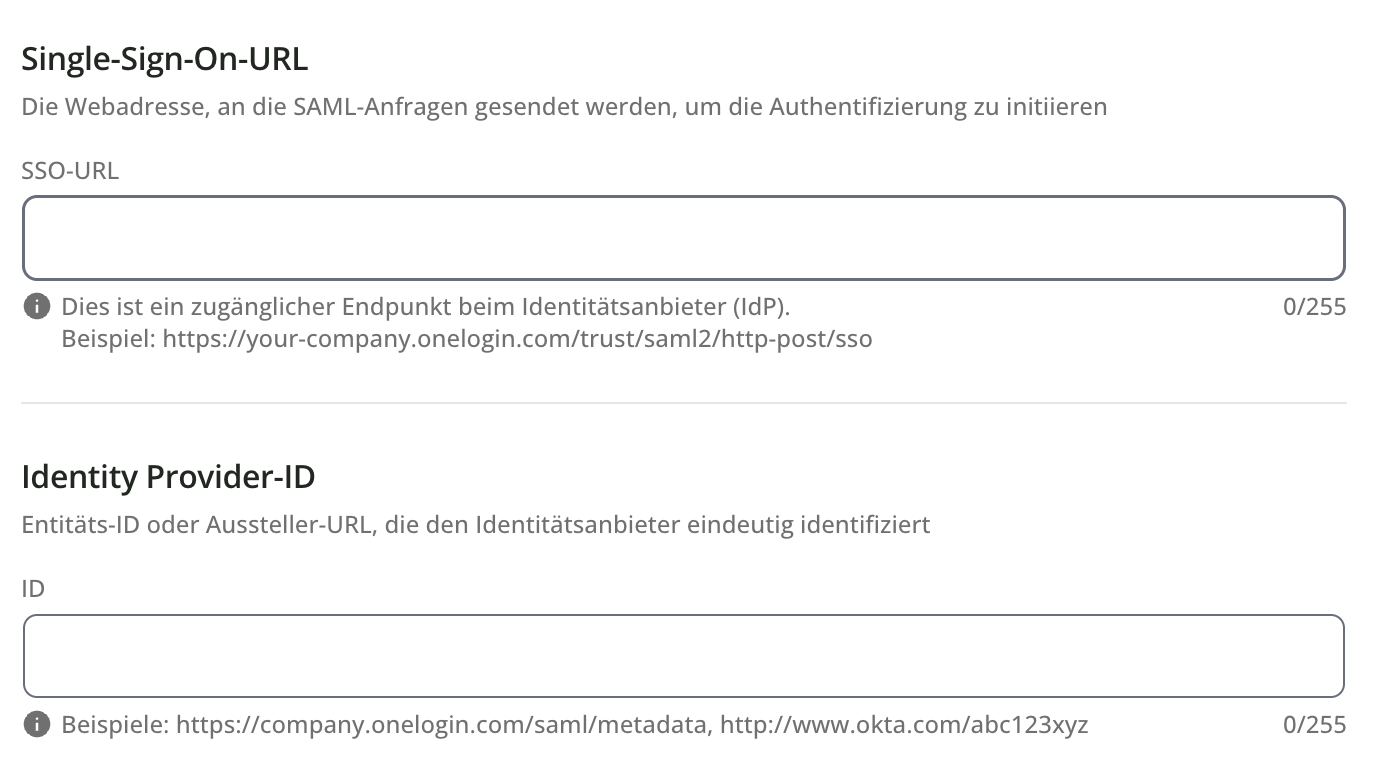 Identity Provider-ID: Dies ist eine eindeutige Kennung für den SAML-Dienst Ihres Kontos beim Identitätsanbieter. Zum Beispiel ist es bei OneLogin die Issuer URL, bei Microsoft Entra die Microsoft Entra Identifier.