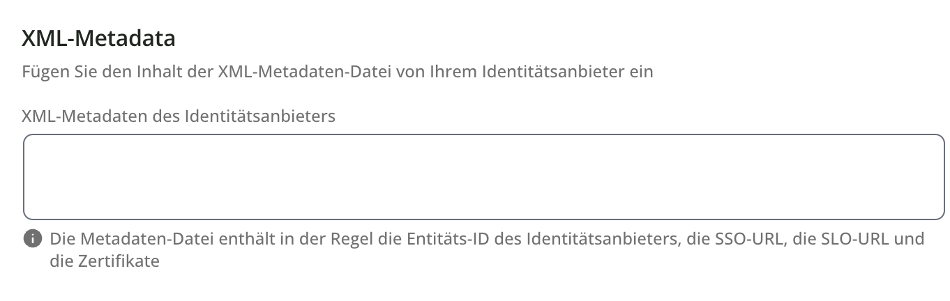 Für die Standard-Konfiguration müssen Sie in diesem Bereich den Inhalt der XML-Metadatendatei einfügen, die Sie von Ihrem Identitätsanbieter erhalten haben.