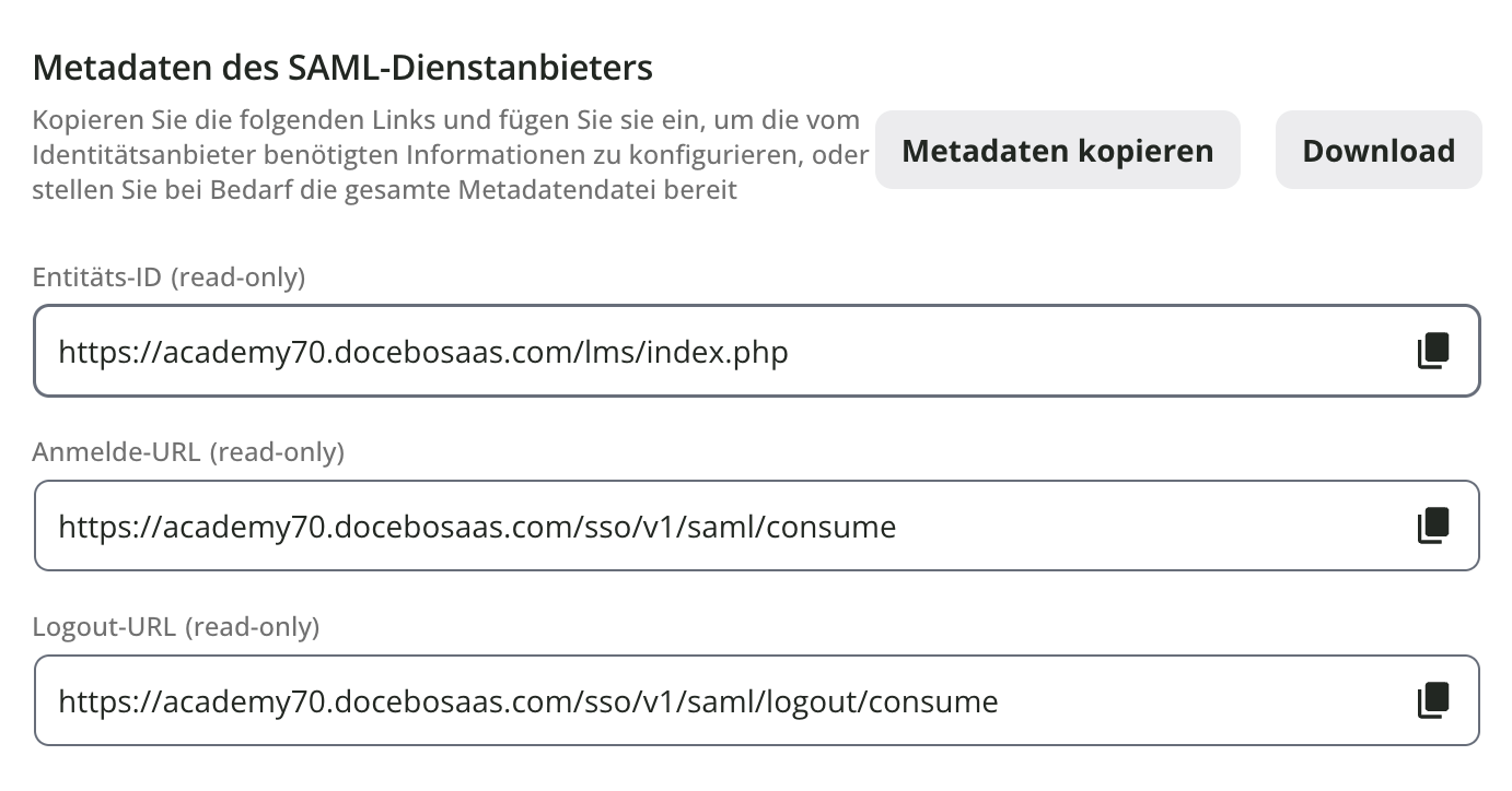 - Greifen Sie anschließend auf die SAML-Einstellungsseite zu und kopieren Sie im Bereich SAML-Service-Provider-Metadaten die neuen Informationen (wie Entitäts-ID, Anmelde-URL und Logout-URL) und verwenden Sie diese, um die Konfiguration beim Identitätsanbieter zu aktualisieren. So wird der Identitätsanbieter mit der neu konfigurierten Domain verbunden und nicht mehr mit der vorherigen Plattform-URL.