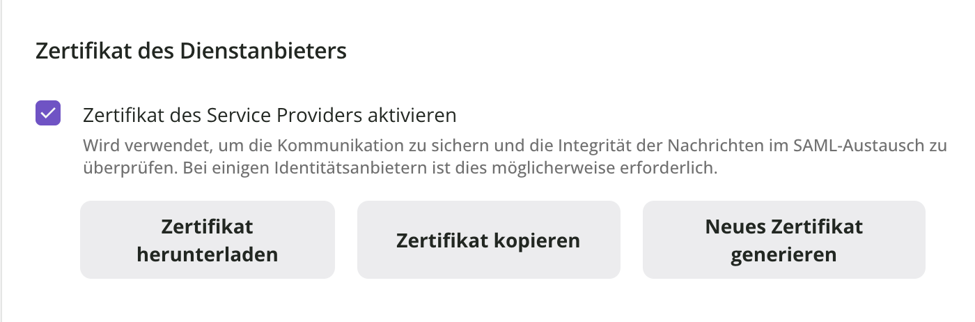 → Um dies konfigurieren zu können, müssen Sie zuvor das Zertifikat des Dienstanbieters aktiviert und generiert haben.