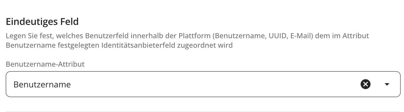 Das "Eindeutiges Feld" erlaubt Ihnen festzulegen, welches Benutzerfeld in der Plattform (Benutzername, UUID, E-Mail) dem Identitätsanbieter-Feld zugeordnet wird, das im Benutzername-Attribut festgelegt ist.