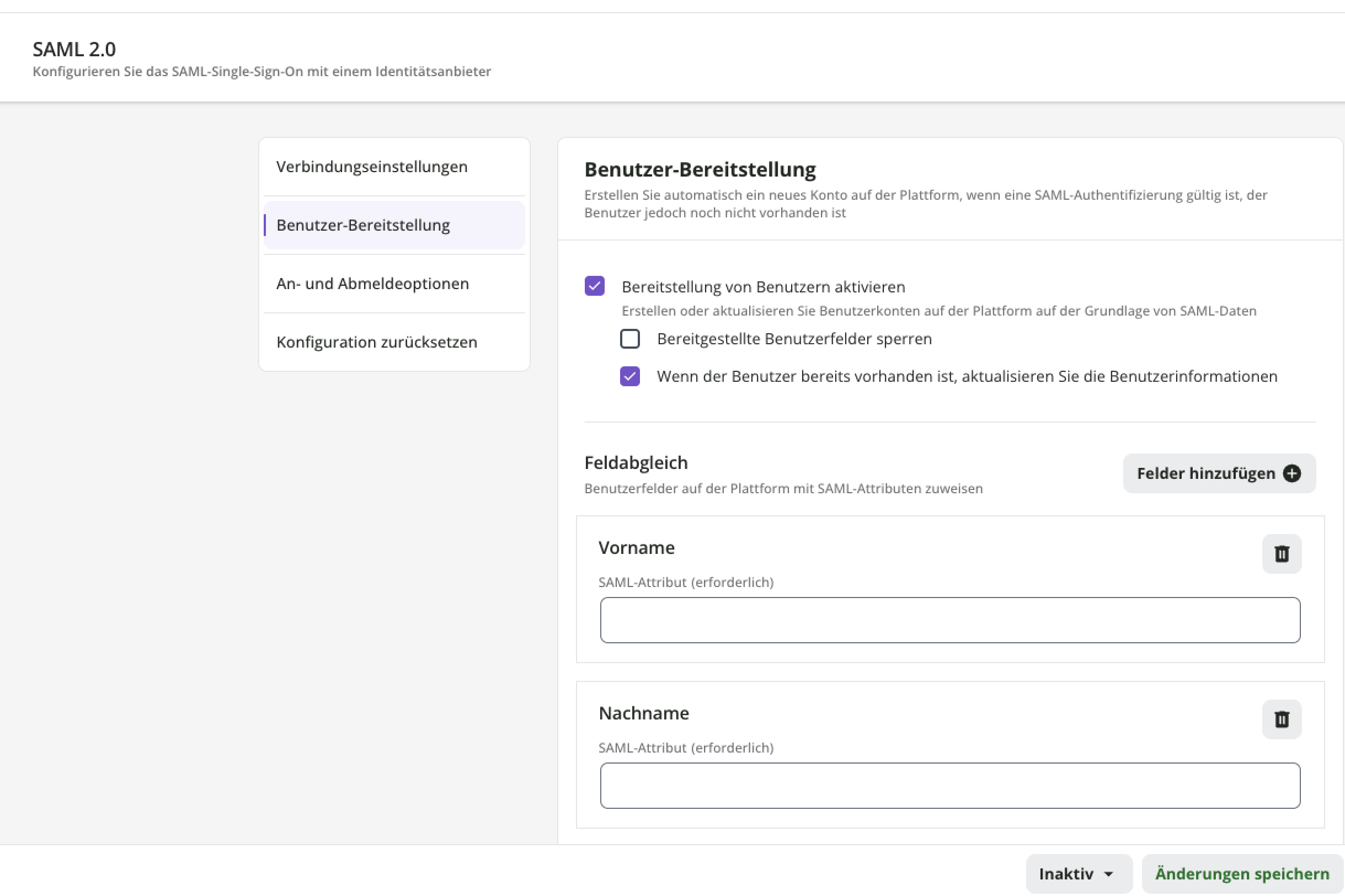 Neu erstellte SAML-Konfigurationen sind standardmäßig im Inaktiven-Status. Wenn Sie die SAML-Konfiguration fertig eingerichtet und Änderungen speichern, denken Sie daran, sie auch mit der Schaltfläche unten auf dem Bildschirm auf Aktiv zu setzen.