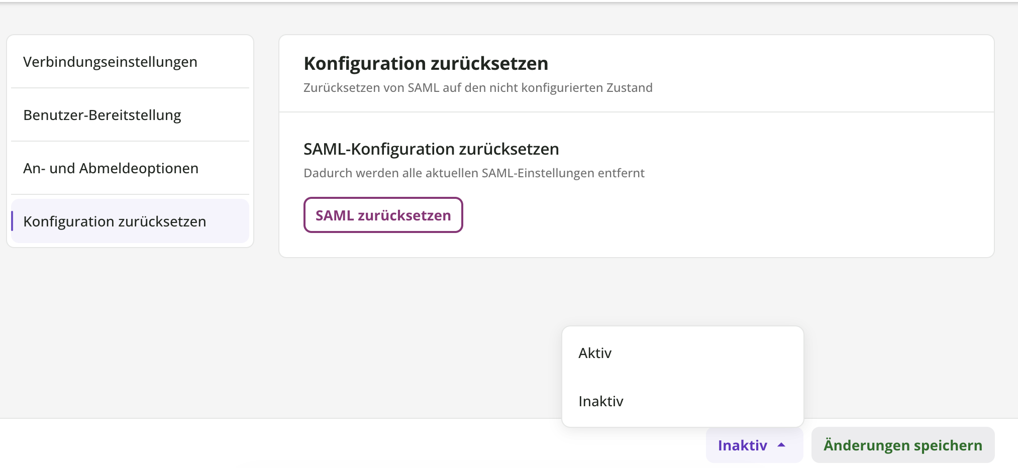 Diese Option entfernt alle aktuellen SAML-Einstellungen und setzt SAML auf den nicht konfigurierten Zustand zurück.