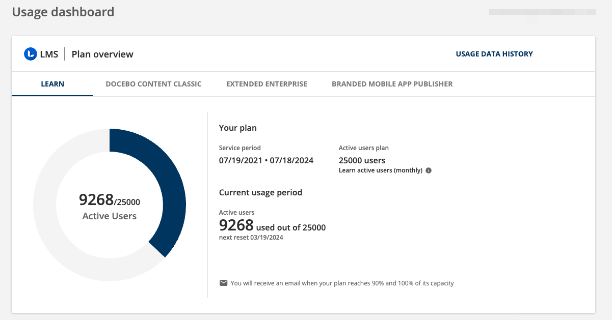 Please note! If you are using Docebo Content and have reached 100% of your active users for the current period, please contact us through your platform’s Help center to request additional users for that period. The consumption of training materials from Docebo Content will be blocked for exceeding users.