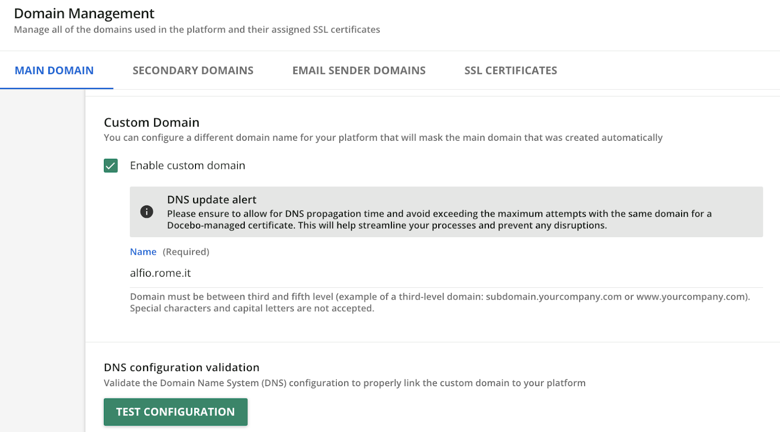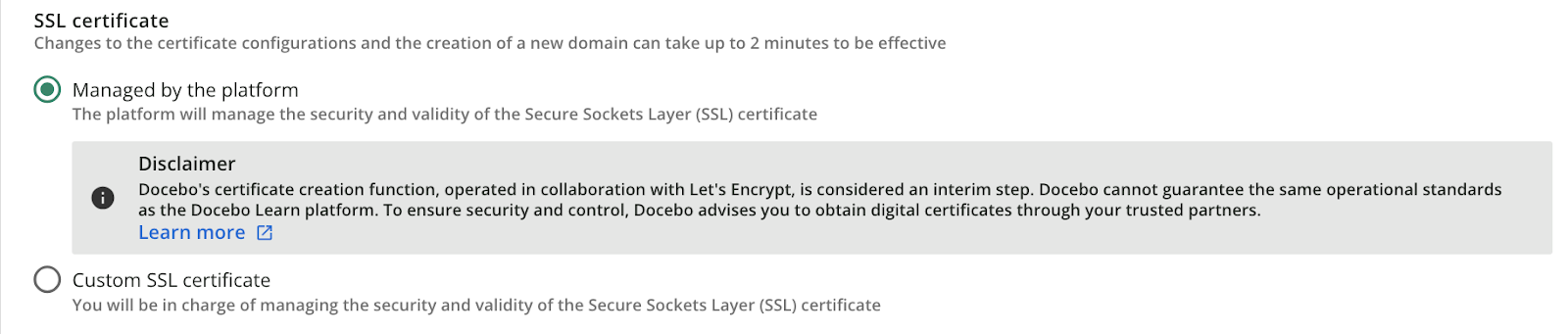 Attention: Docebo-managed certificates are managed in partnership with an external service that Docebo does not control (Let's Encrypt - link opens in new tab), therefore Docebo cannot guarantee its operation with the same standards with which the Docebo Learn platform operates. As such, the certificate creation functionality managed by Docebo should be treated as an interim step.