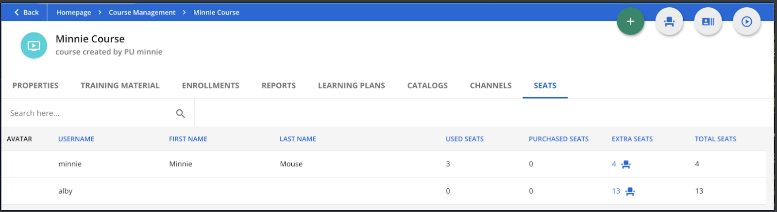 - Select the Seats tab. Here you will see all the Power Users who have seats for this course.