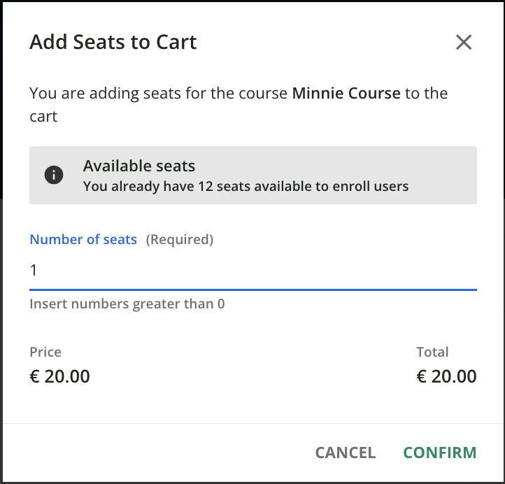 → If the Power User already has some seats for this course, the ones you set here will be added to the existing ones. - When you are finished click Confirm.