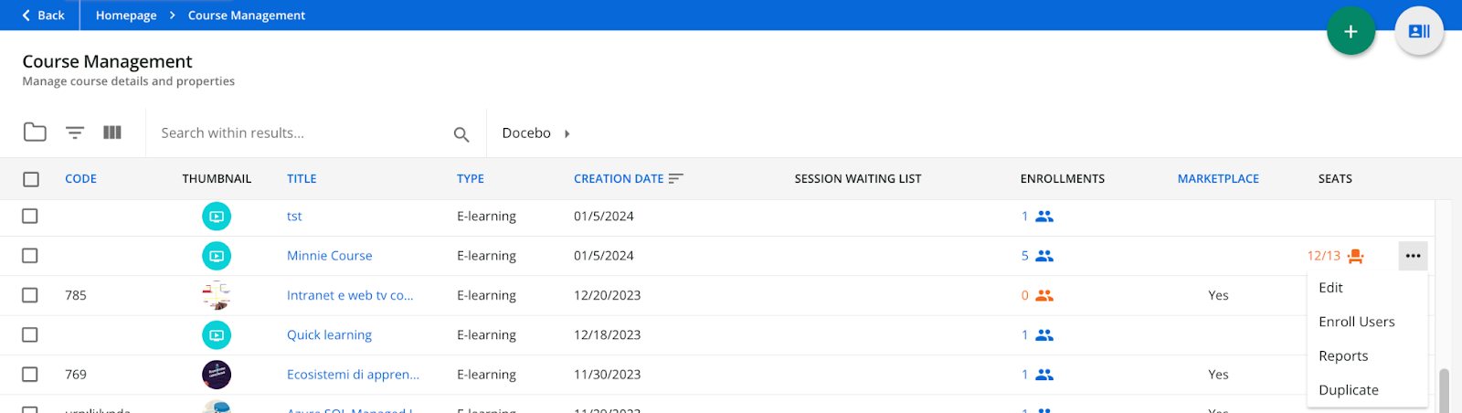 - Select Admin menu > E-learning > Course management. In the list of courses, locate the course in which you want to enroll users.