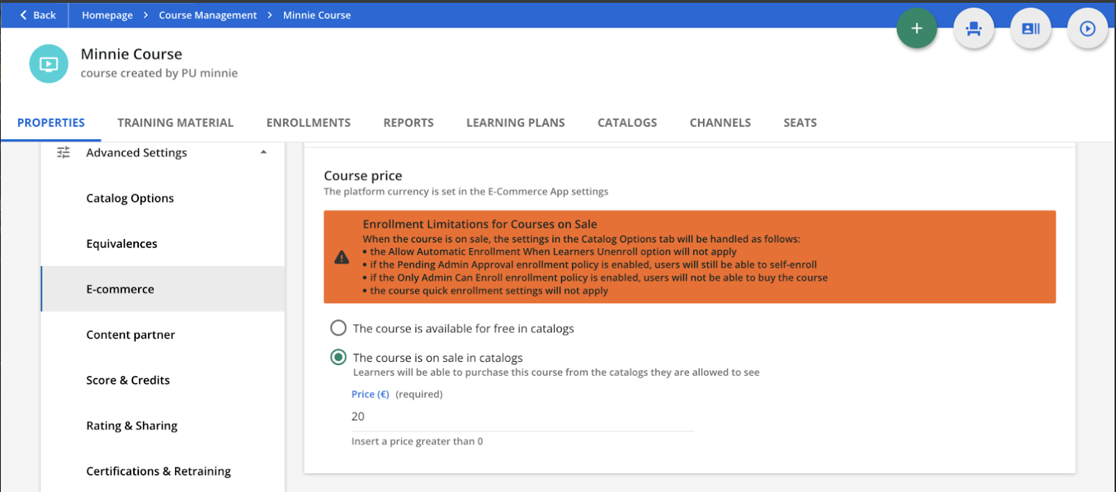 → You can find this setting in Course management > {course name} > Properties tab > Advanced settings > E-commerce.