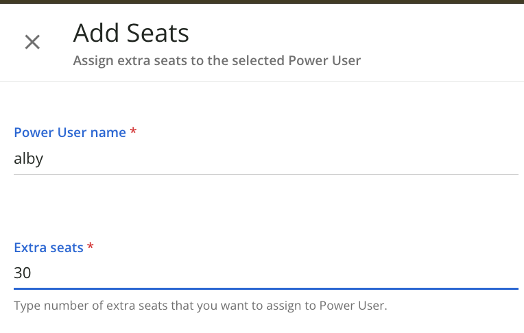 - In the Edit seats panel that opens, you can change the number of extra seats assigned to this Power User, either decreasing or increasing it. Directly enter the new value of seats that you want this Power User to have.