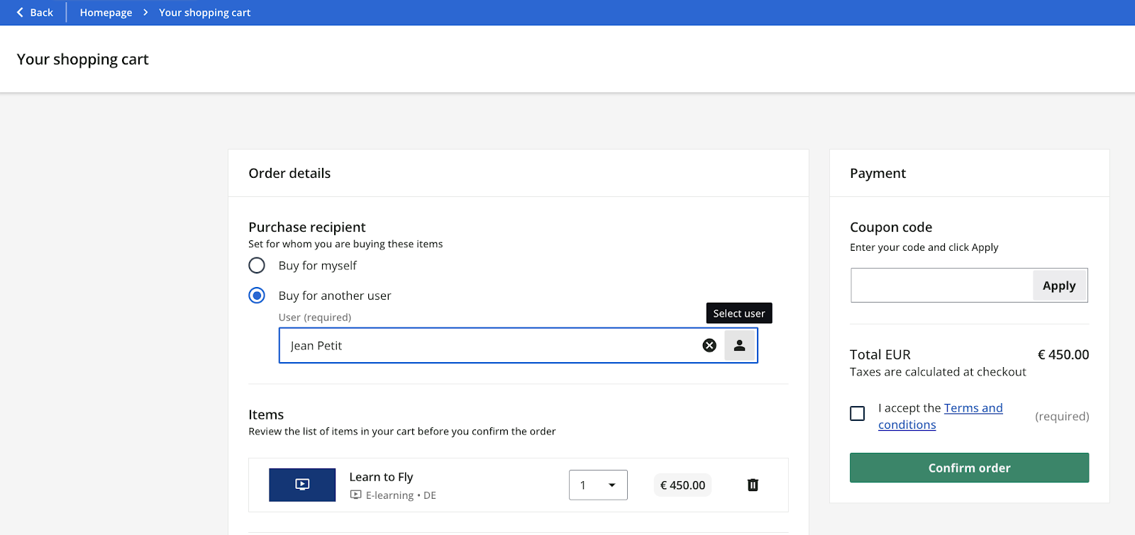 → A dialog box warns you that, when buying for another user, you can only purchase one seat per course. Click Confirm. - In the User field, enter the name of the recipient of your purchase. You can start typing the first few letters and then select from the list. Or you can click the Select user icon to open a panel and browse all your assigned users.