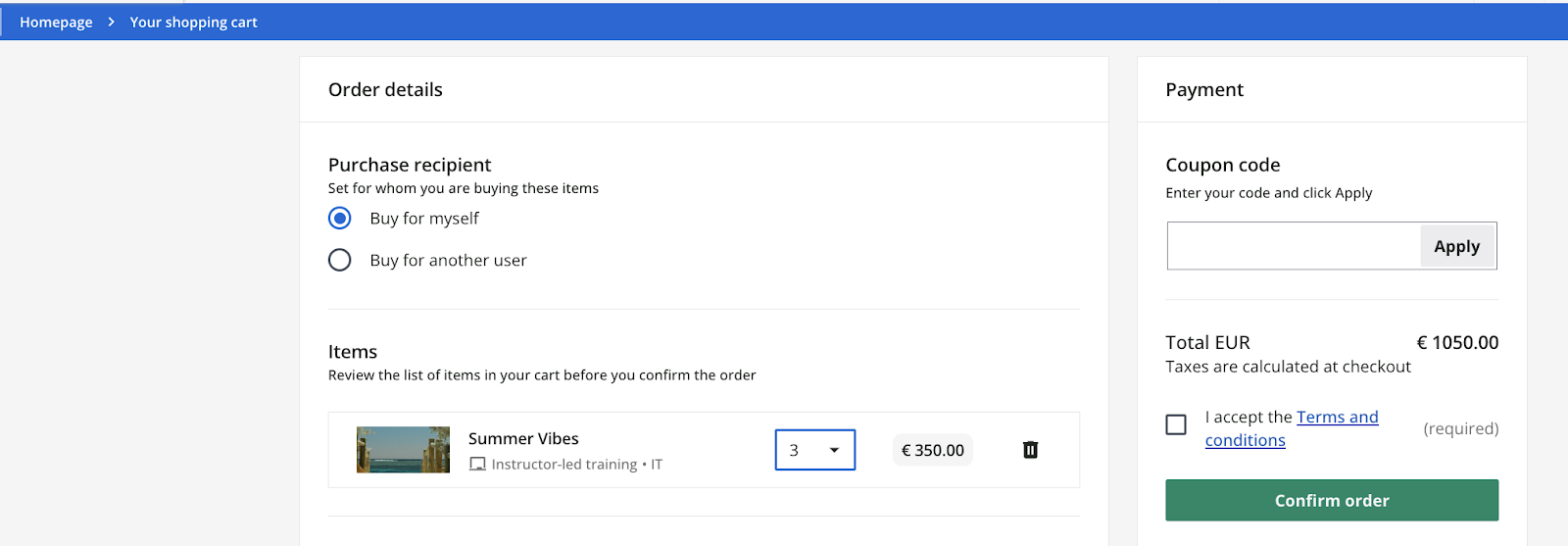Please note: Depending on your permissions, the shopping cart may show you an option to Buy for another user. However, you cannot actually purchase seats for someone else. If you select this option you will be able to purchase a single enrollment in the course for the designated recipient user. See How to purchase a course for someone else