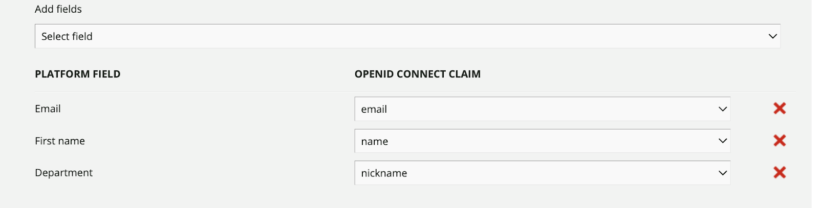 You configure this in the Add fields section. This will appear slightly different depending on which SSO configuration you are using, but in all cases it allows you to match up other fields on the identity provider side with the corresponding platform fields.