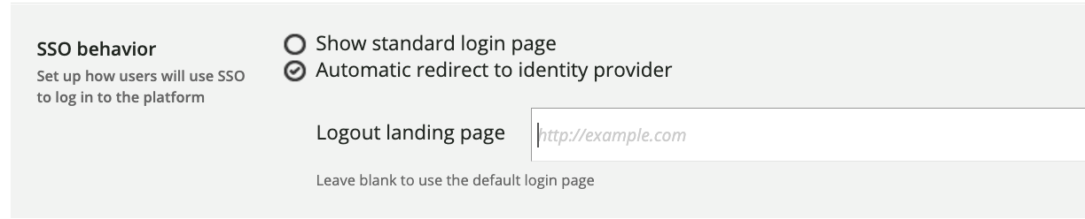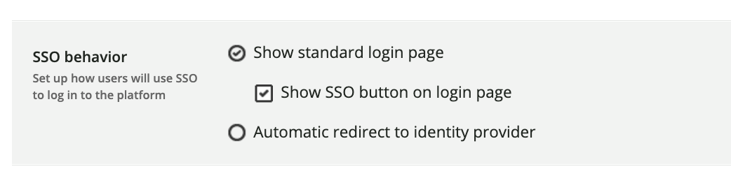 The SSO behavior settings let you configure how users will log in to the platform through single sign-on. There are two options available: Show standard login page and Automatic redirect to identity provide