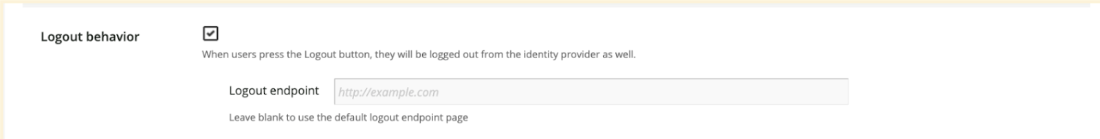 - In some SSO configurations, when this option is selected, a Logout endpoint text field appears. Here you can define a URL where users will land upon logging out from the platform and from the identity provider.
