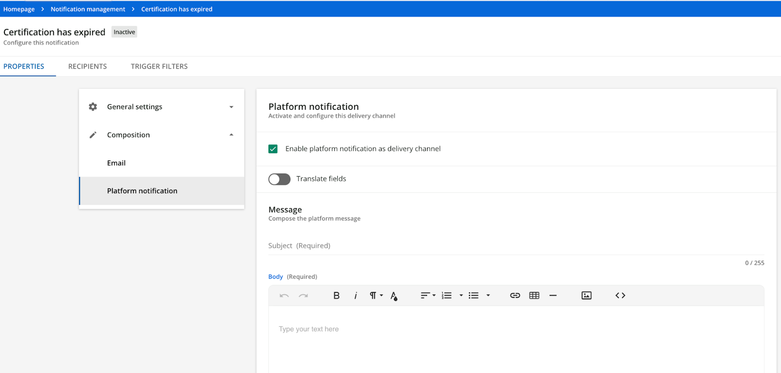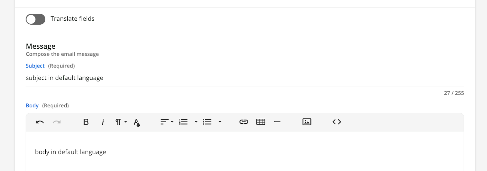 When you first create a notification and go to enter the message text for your chosen delivery channel, you will see the Translate fields toggle is initially set to off.