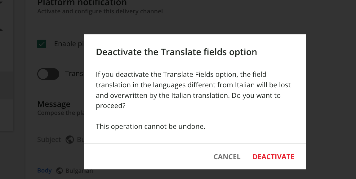 Please note that there is no way of removing an individual translation once you have added it. Even if you clear both the Subject and Body fields in that language, the translation remains activated. This means the notification would still be sent out in that language, but with an empty message.