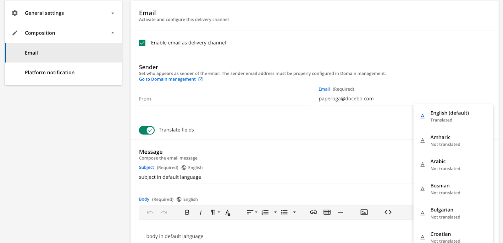 When you configure a notification, you can compose its text in just the default language, or you can also compose translations in one or more additional languages. This makes it possible to send out notifications in the recipient’s preferred language, even if different from the platform default.