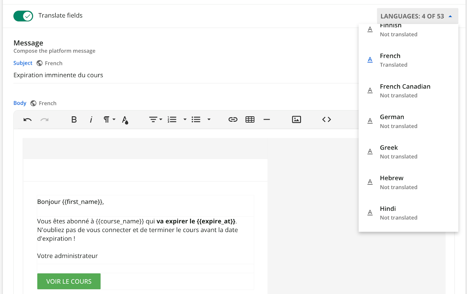 Please note that shortcode values in the notification message will not be translated. For example if a course title is in English, the {{course_name}} shortcode will be populated with that English title for all translations of your message text.