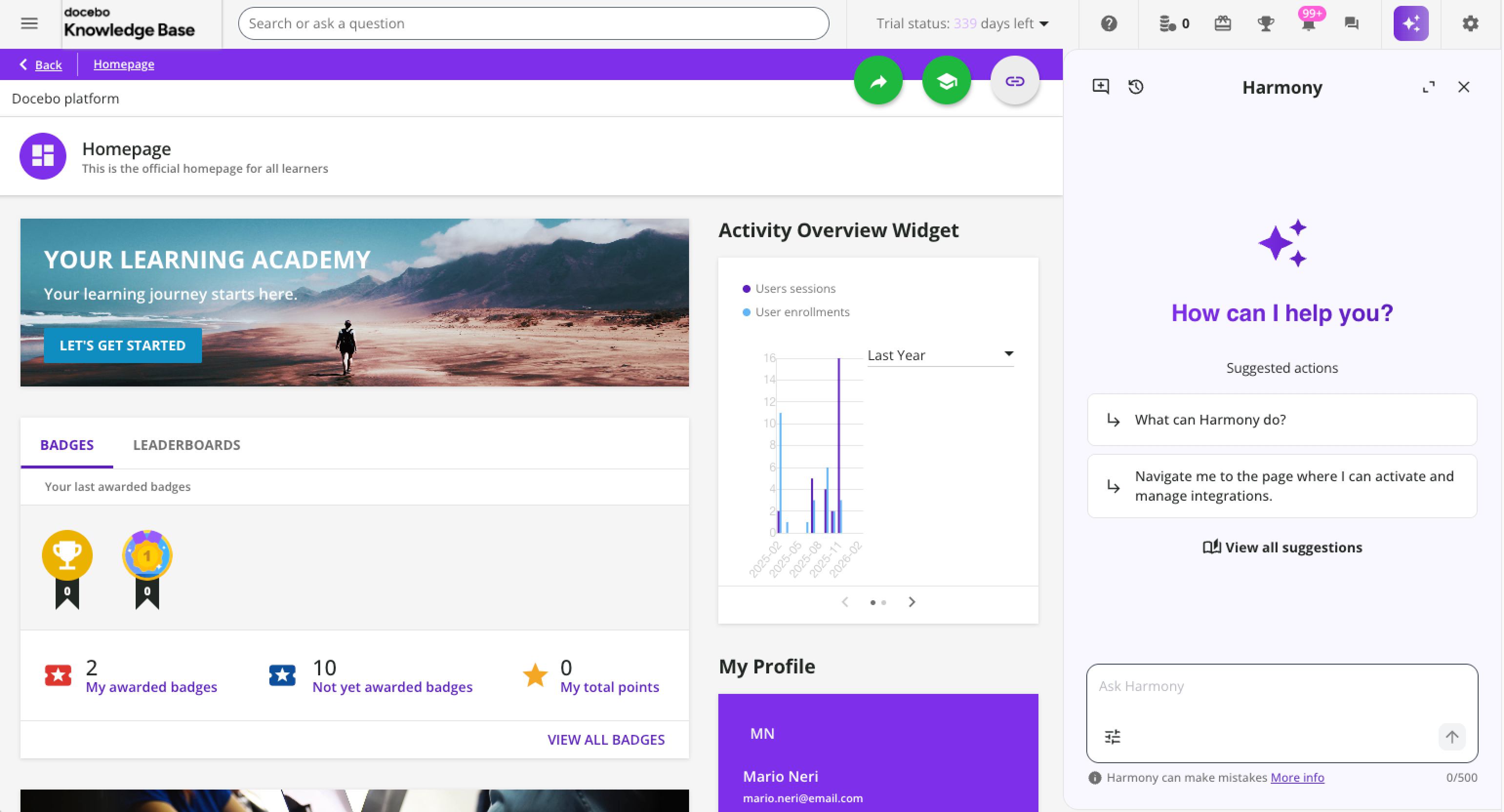 - Docebo Community guides offer curated tutorials that the Harmony copilot leverages as an additional knowledge source.