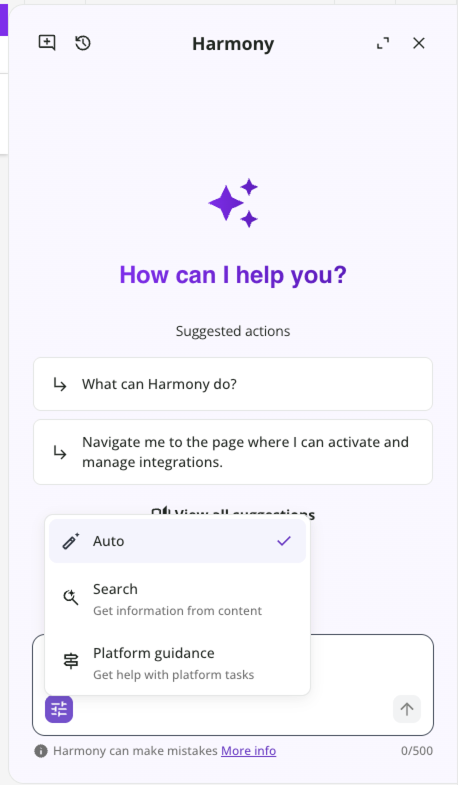 Access the copilot conversational panel by clicking on the Harmony icon in the platform header. When you open the panel, Harmony automatically displays some suggested prompts relevant to your current page, helping you get started quickly without having to think of a question on your own. The suggested prompts automatically refresh as you navigate to different pages in the platform, ensuring the help you receive is always relevant to your current context.