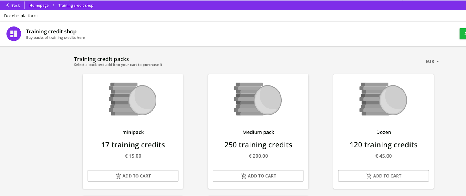 → Note that packs are currency-specific. If you set a pack price in EUR, it will be visible only when the training credit shop is set to the EUR currency.