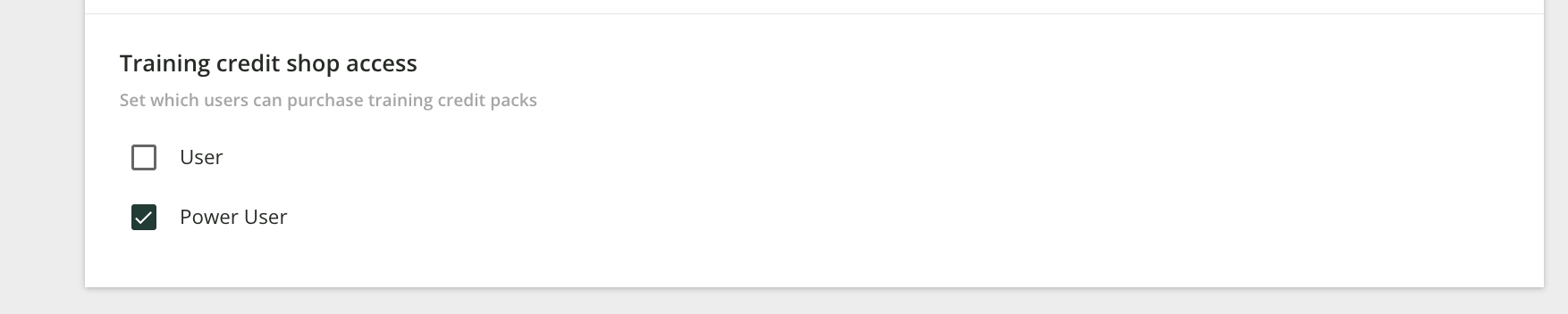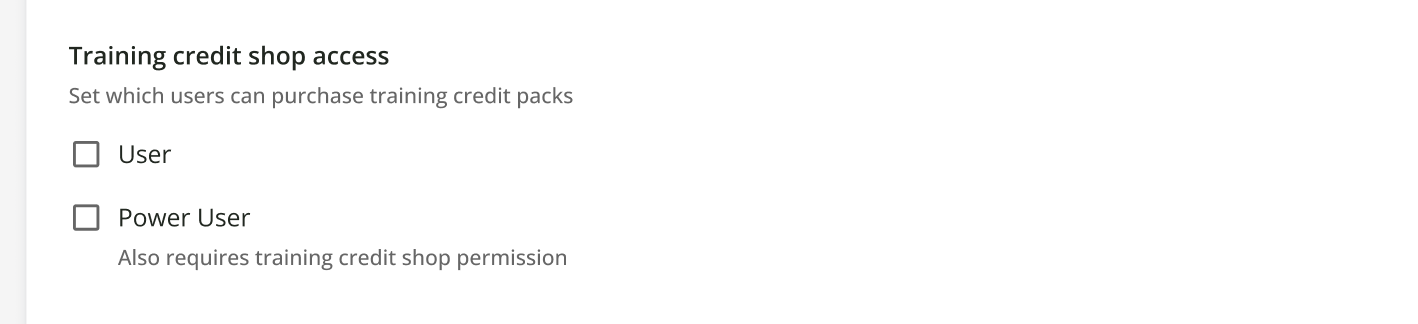 - Select the Training credits tab and, under Training credit shop access select which users should be able to purchase training credit packs: Power Users and/or Users. Deselect both options to hide the training credit shop altogether.