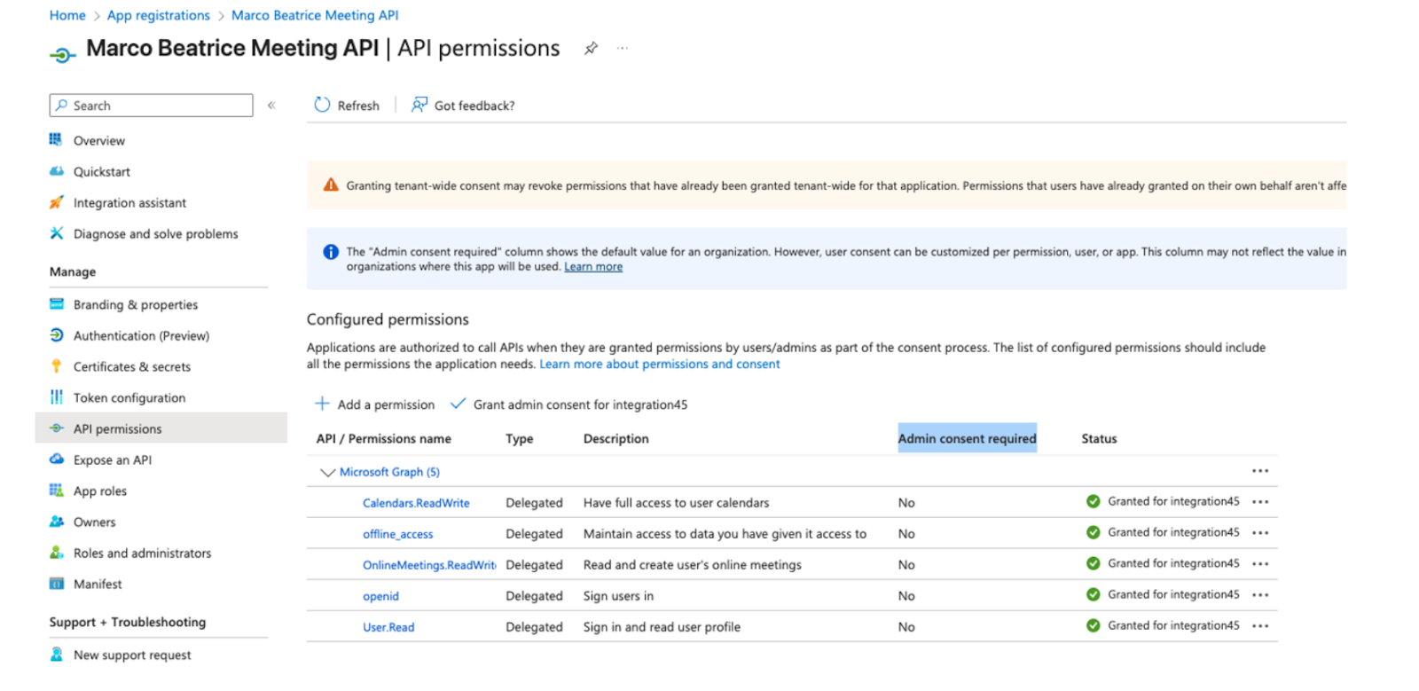 Please note: Make sure that in the Status column all the permissions are marked as Granted. You can do this by clicking Grant admin consent at the top of the list.