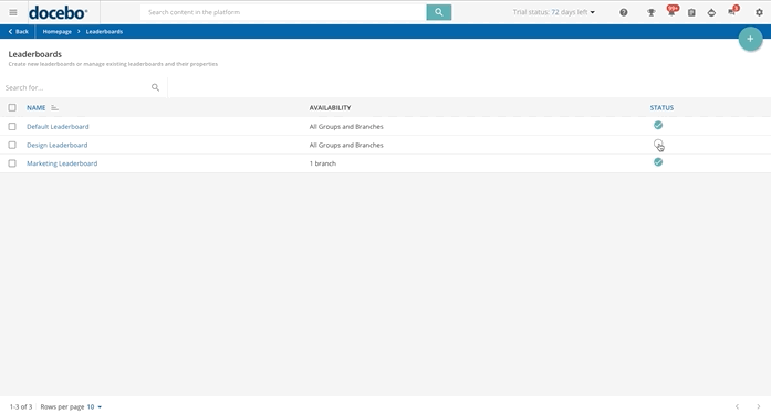 Remember that all groups and branches can participate in the default leaderboard, but, if you want, you can edit the setting in the Availability tab (see chapter below for further info). You can choose to make the default leaderboard available to users by publishing it via the checkmark icon in the Status column. Please note that you cannot delete the default leaderboard. The green icon means that the leaderboard is already visible and published, and the gray icon means that it is hidden and unpublished. You can press the icon again to hide (unpublish)/show (publish) the leaderboard. Remember to publish the default leaderboard to make it available to your users, since by default it is not published. In the Availability column, you will see which groups and/or branches have the permissions to see and participate in the leaderboard.