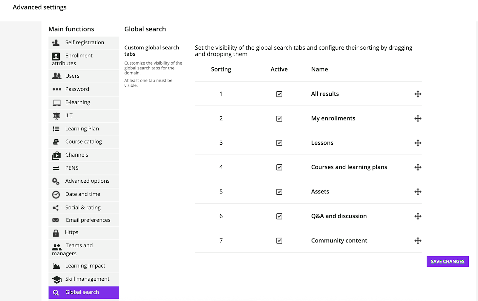 These settings let you customize which areas should be included when a user performs a global search of the platform’s content.