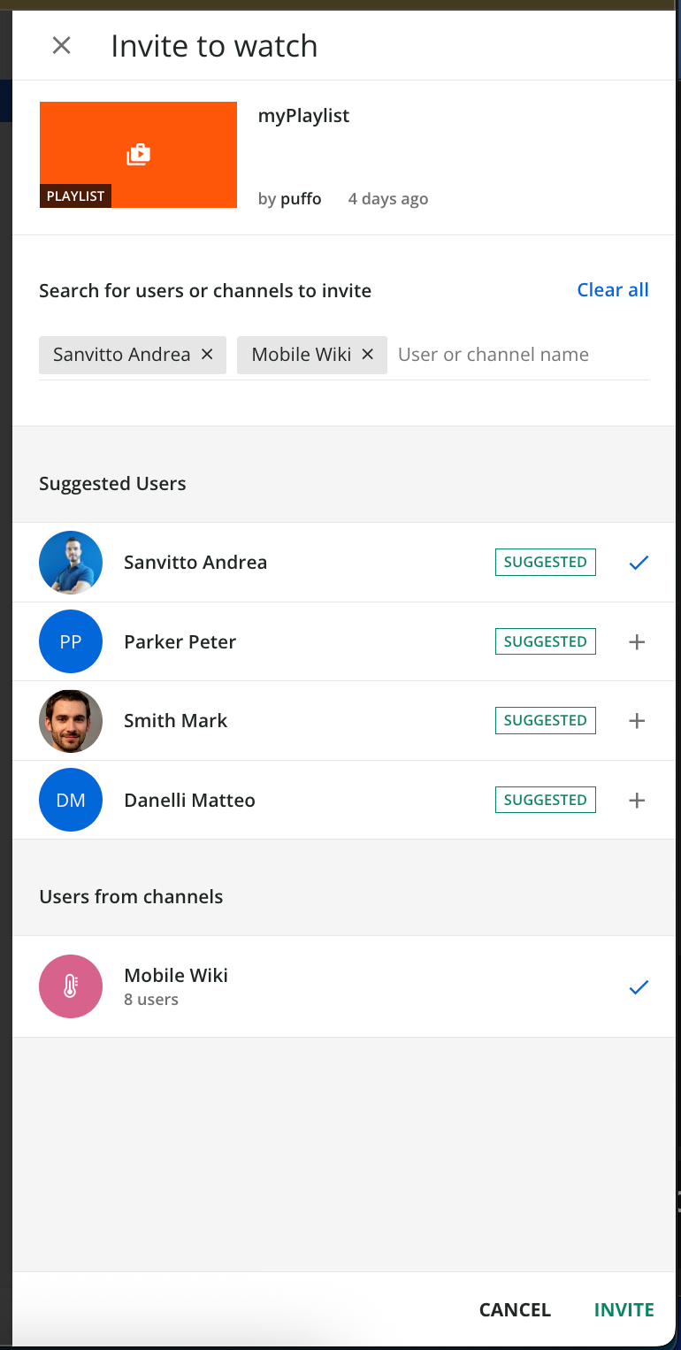 - Individual users with visibility of a channel where the asset was shared. It is also possible to select an entire channel where the asset was shared, and invite to watch all its members. The invitation can be sent by anyone who has visibility of the channel.