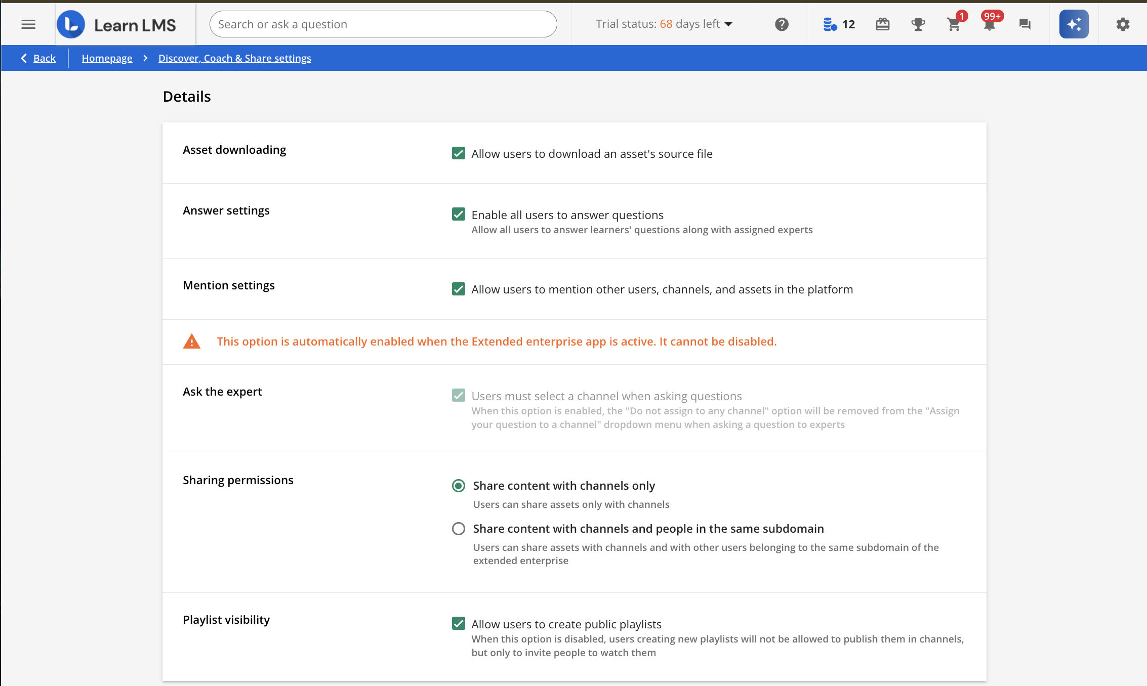 The Discover, Coach & Share area of the platform lets you control the settings relating to sharing of informal content (assets) uploaded to channels, questions and answers, mentions, playlists, and ask the expert.