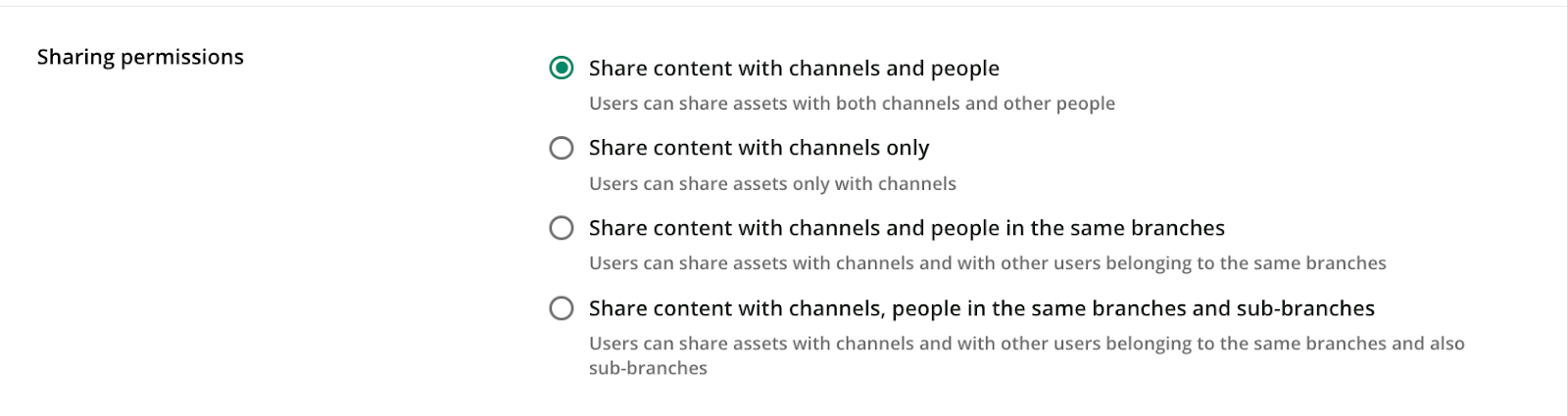The Sharing permissions options let you control whether learners can upload assets only to channels, or also share them directly with other people. Sharing with people can be limited to users in the same branch as the sharer, either including or excluding sub-branches.