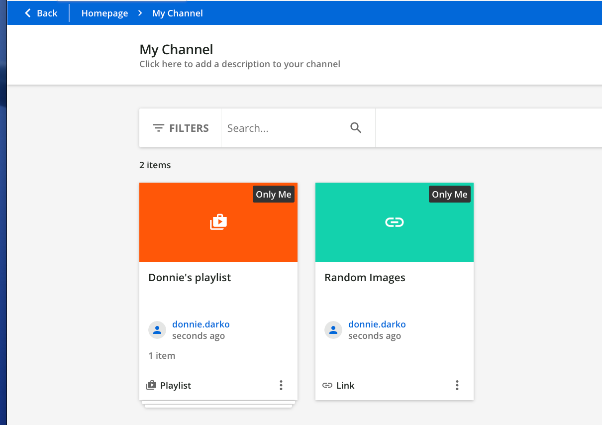 On their My Channel page, users will see assets or playlists marked as “Only me” if they have not been shared with any channels or people.