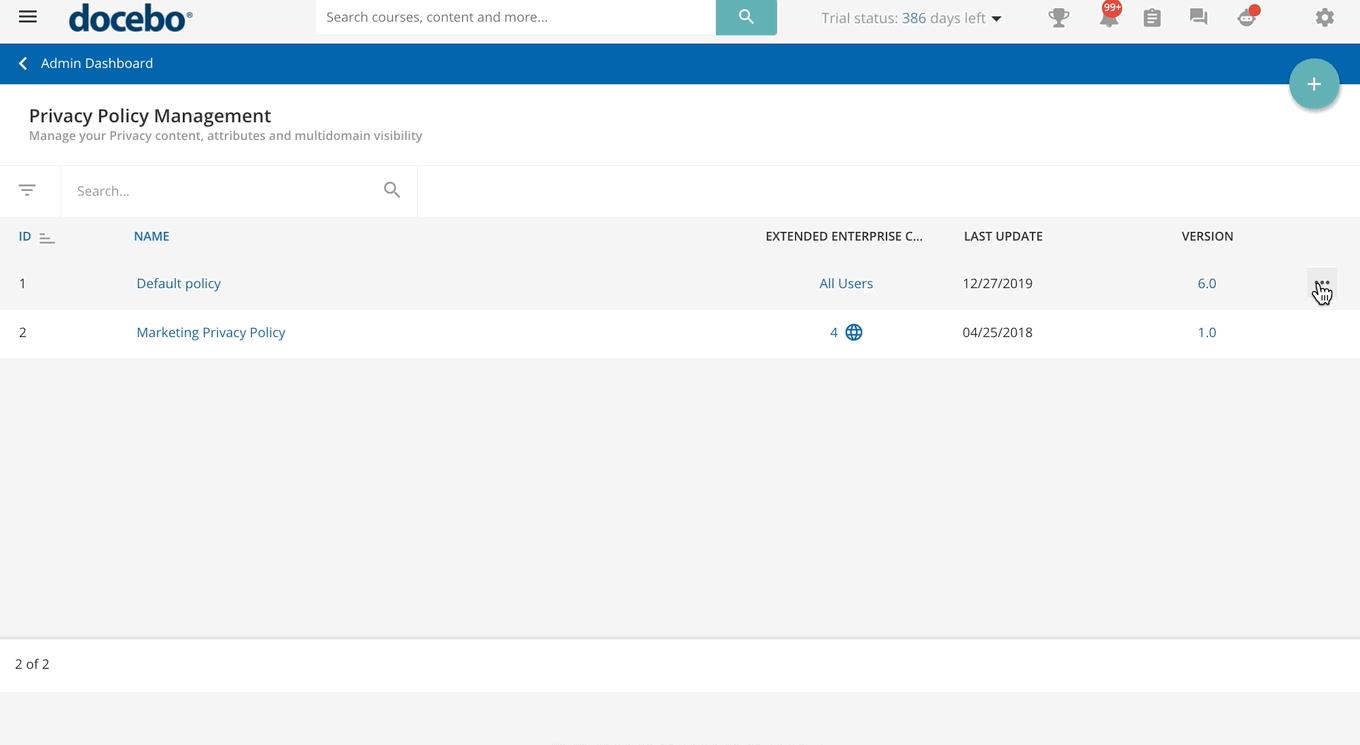To edit the default policy for the first time, access the Privacy Policy management area from the Admin Menu, find the default policy in the list (it will be labeled accordingly), then press the ellipsis icon at the end of the policy’s row. Refer to the following section to learn about creating and managing the content of a privacy policy, as the process of editing the content of a policy is the same for all policies, including the default privacy policy. Every time you update the content of a privacy policy, a new version is created, so all users assigned to the default policy will have to re-accept the privacy policy. Refer to the following section regarding how to manage versions of your privacy policies.