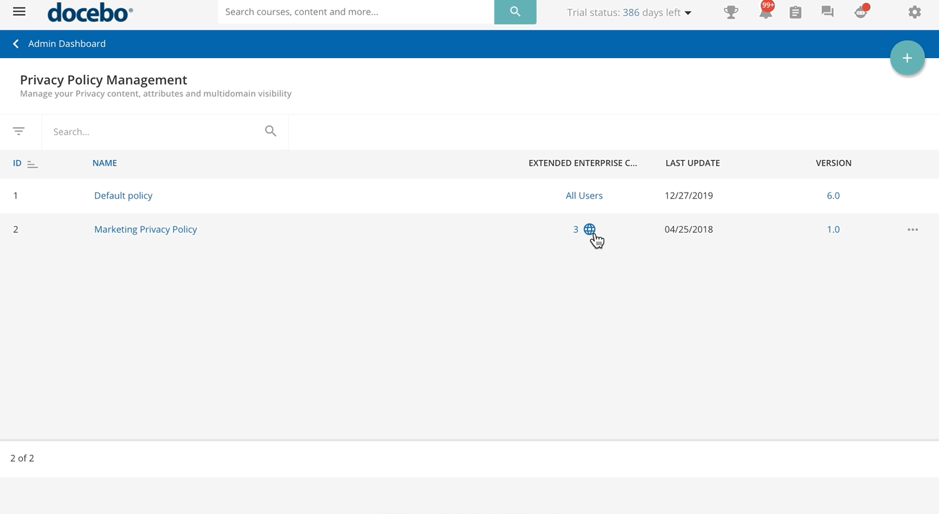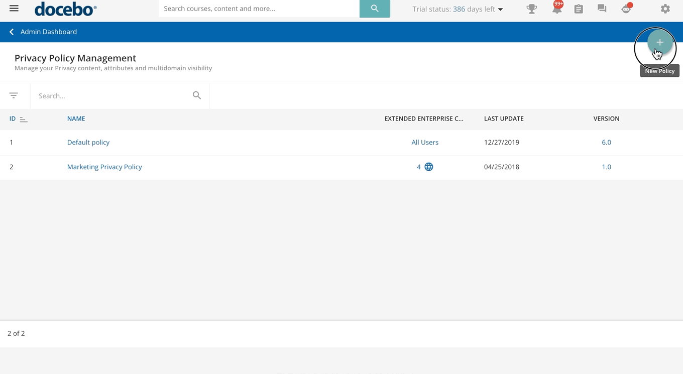 In your platform, you can create a customized privacy policy for your users to accept when registering or logging into the platform. You can also create and assign specific privacy policies to specific domains, for those using Docebo’s Extended Enterprise app.