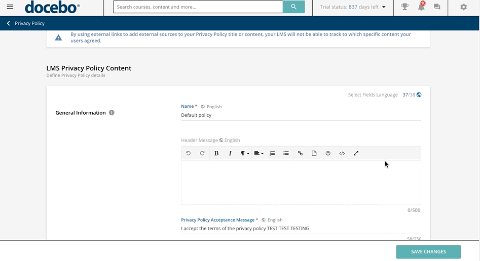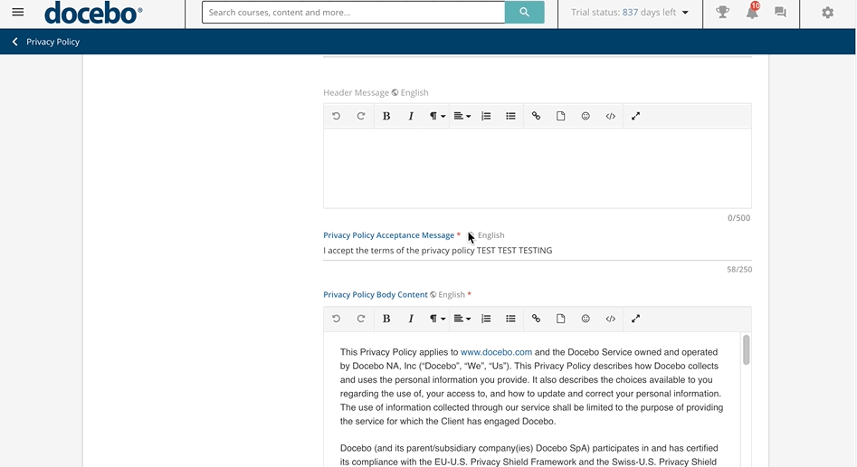 Please note that when you’re creating or editing a policy in the platform’s default language, the default language fields are mandatory. However, when adding content in a language that is not the default language, the fields are not mandatory. Therefore, if you do not populate a field in one of the additional languages, that field will appear to users in the default language instead of appearing blank. For example, if your default language is English, you must fill out every field of the privacy policy in English. If you then create content of the same policy in French but you do not fill out the acceptance message, learners with their platforms set in French will see the acceptance message of their privacy policy in English.