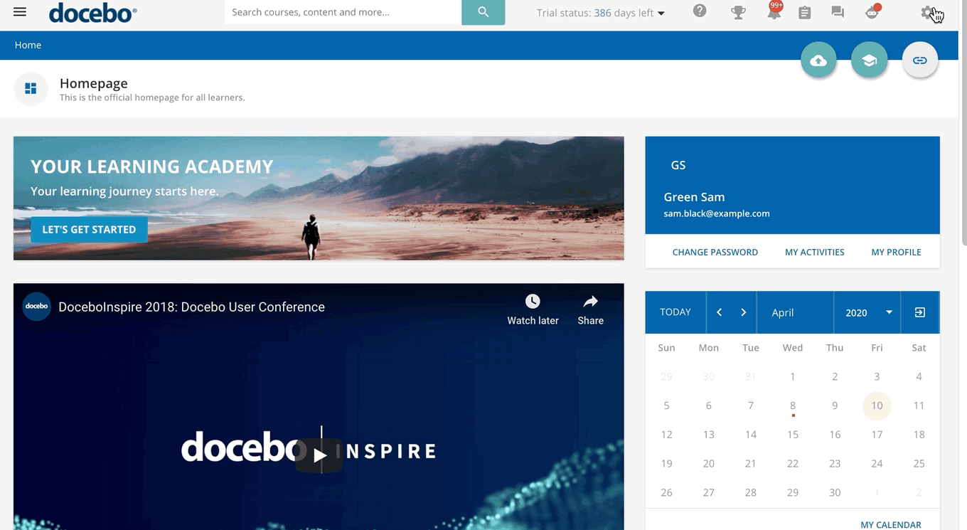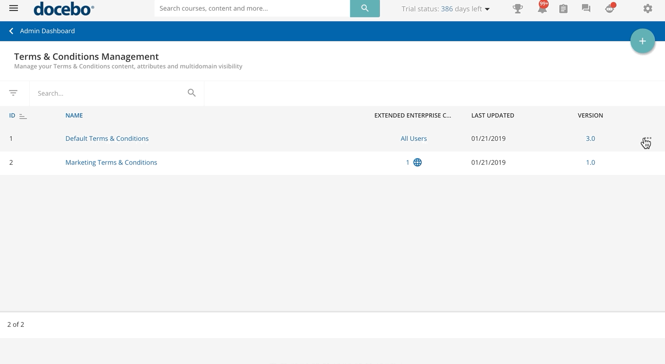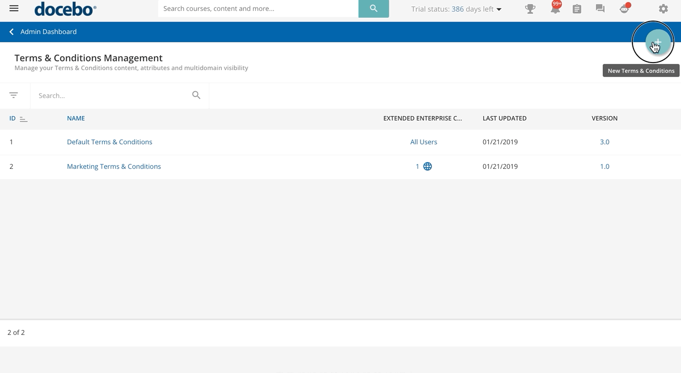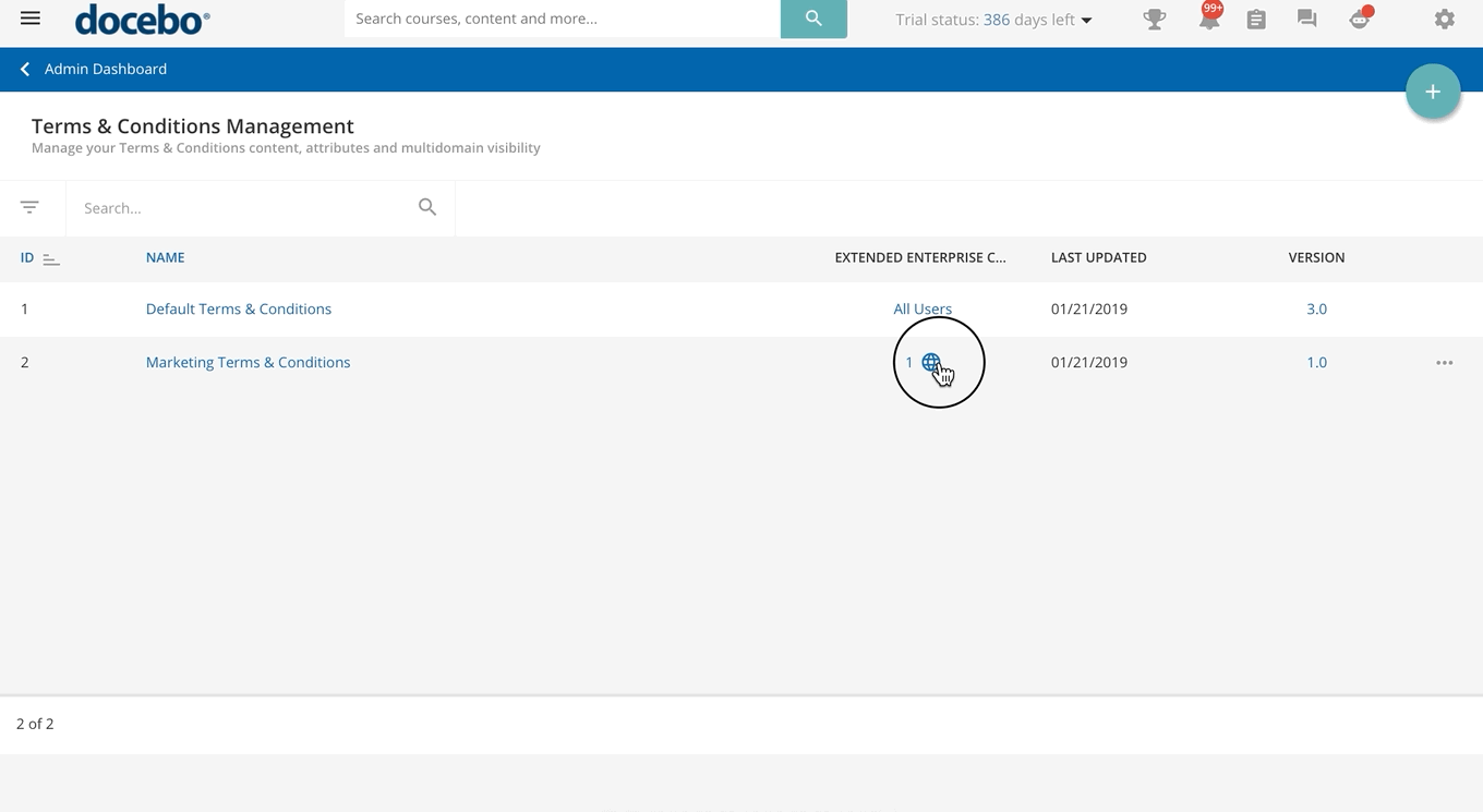 In your platform, you can create customized Terms & Conditions for your users to accept when registering or logging into the platform. You can also create and assign specific Terms & Conditions to specific domains, for those using Docebo’s Extended Enterprise app.