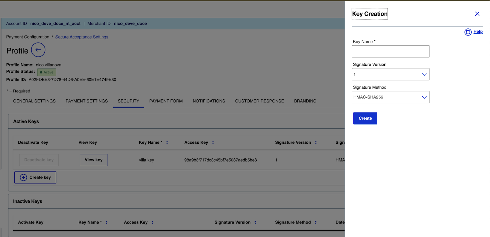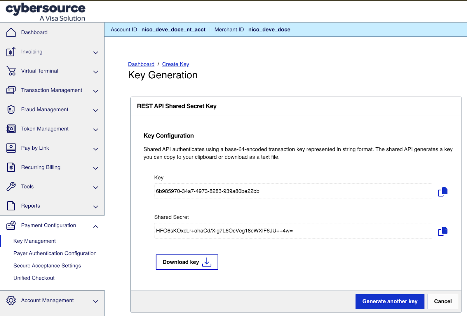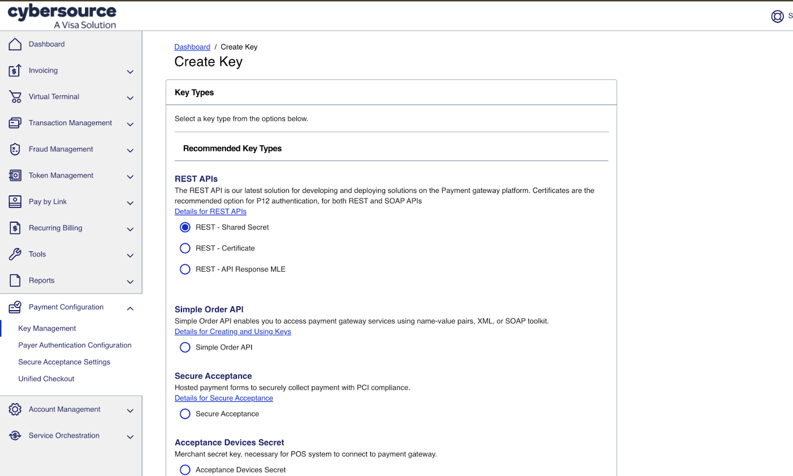 Next, for the automatic tax calculation, you need to generate a REST API key. Note that this is not done from your Secure Acceptance profile page, but from the general Key management page.