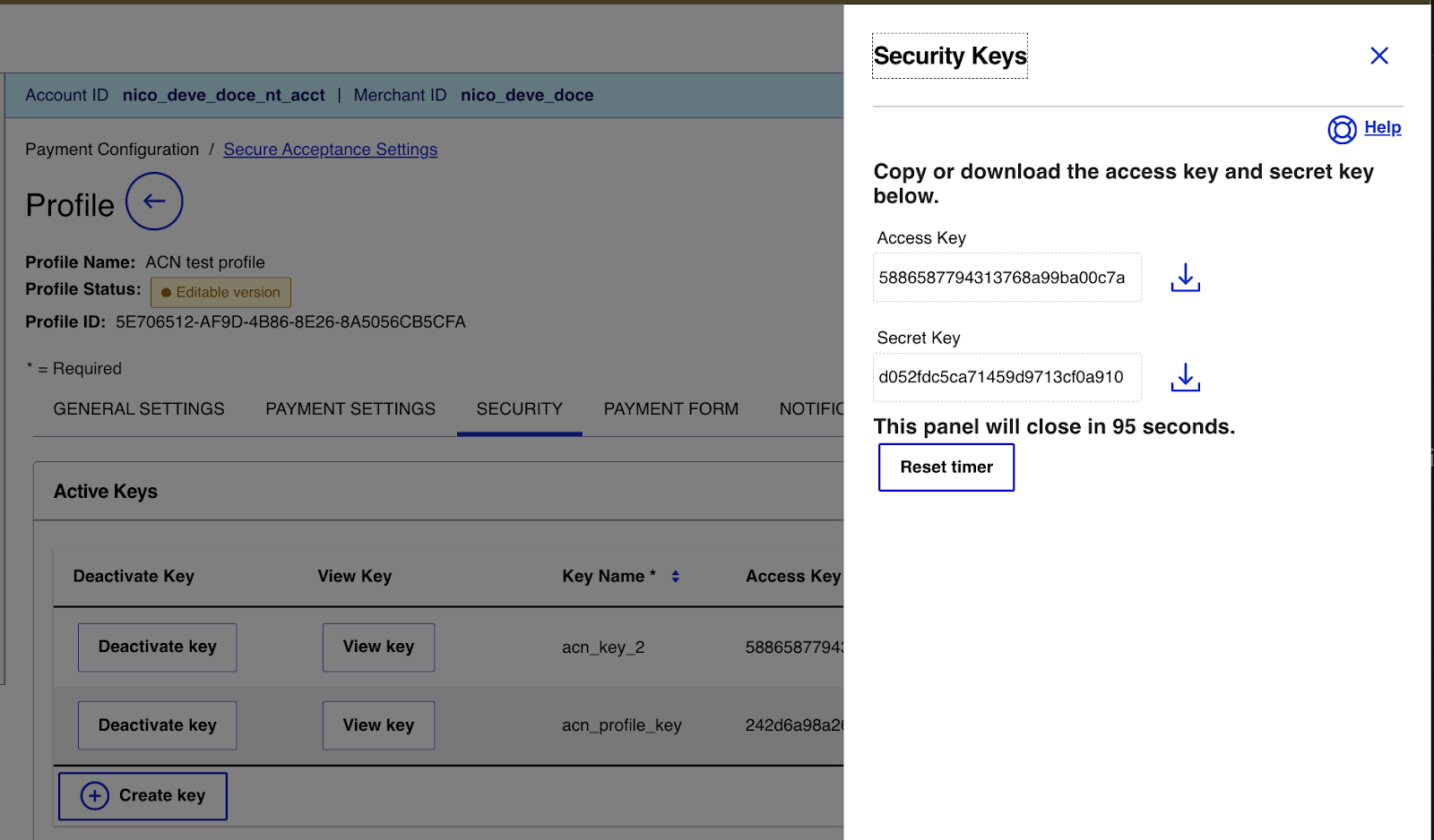 Tip: You will need to enter this Secret Key and Access Key, along with your Cybersource Profile ID (visible at the top of the profile page) when you configure Cybersource in the platform.