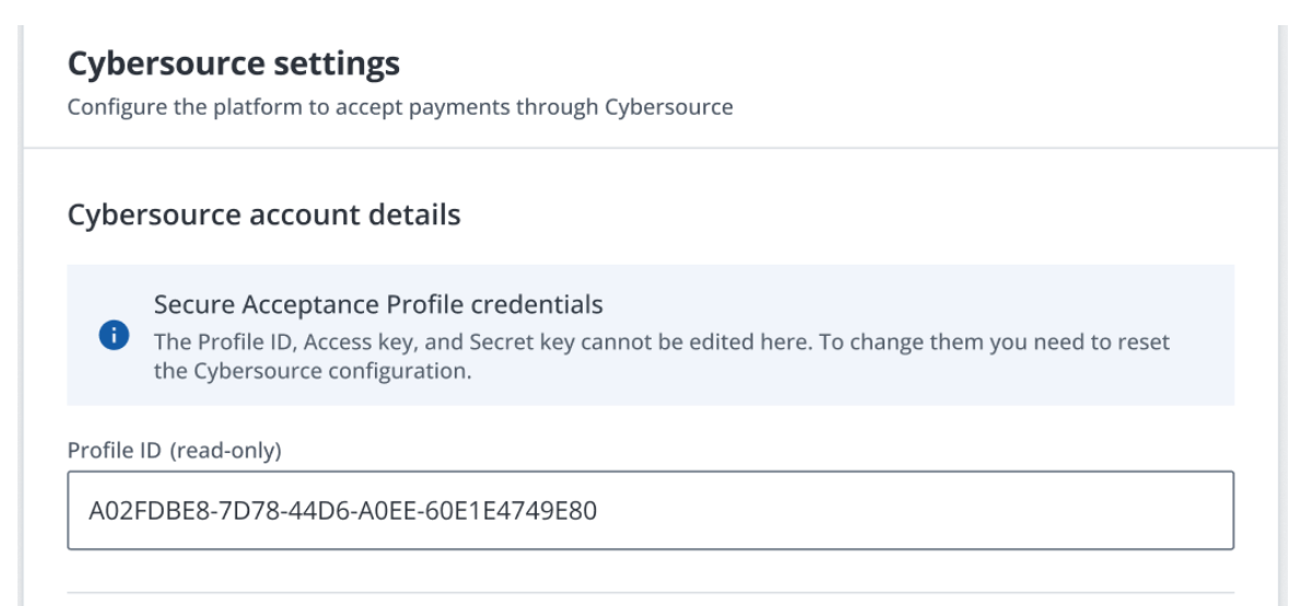 Once Cybersource is configured in the platform, you cannot edit the credentials of the Secure Acceptance profile. Therefore, if you need to edit any of these values – for example, to switch from a sandbox to a production profile, which requires changing the account details – you will need to reset the Cybersource configuration and begin again.