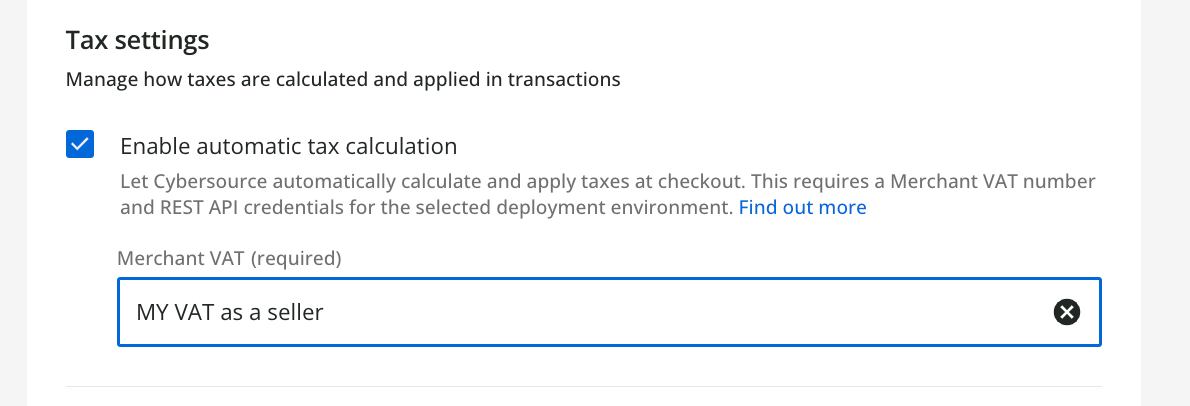 Now, in the platform, select the check box Enable automatic tax calculation, and enter your Merchant VAT number.